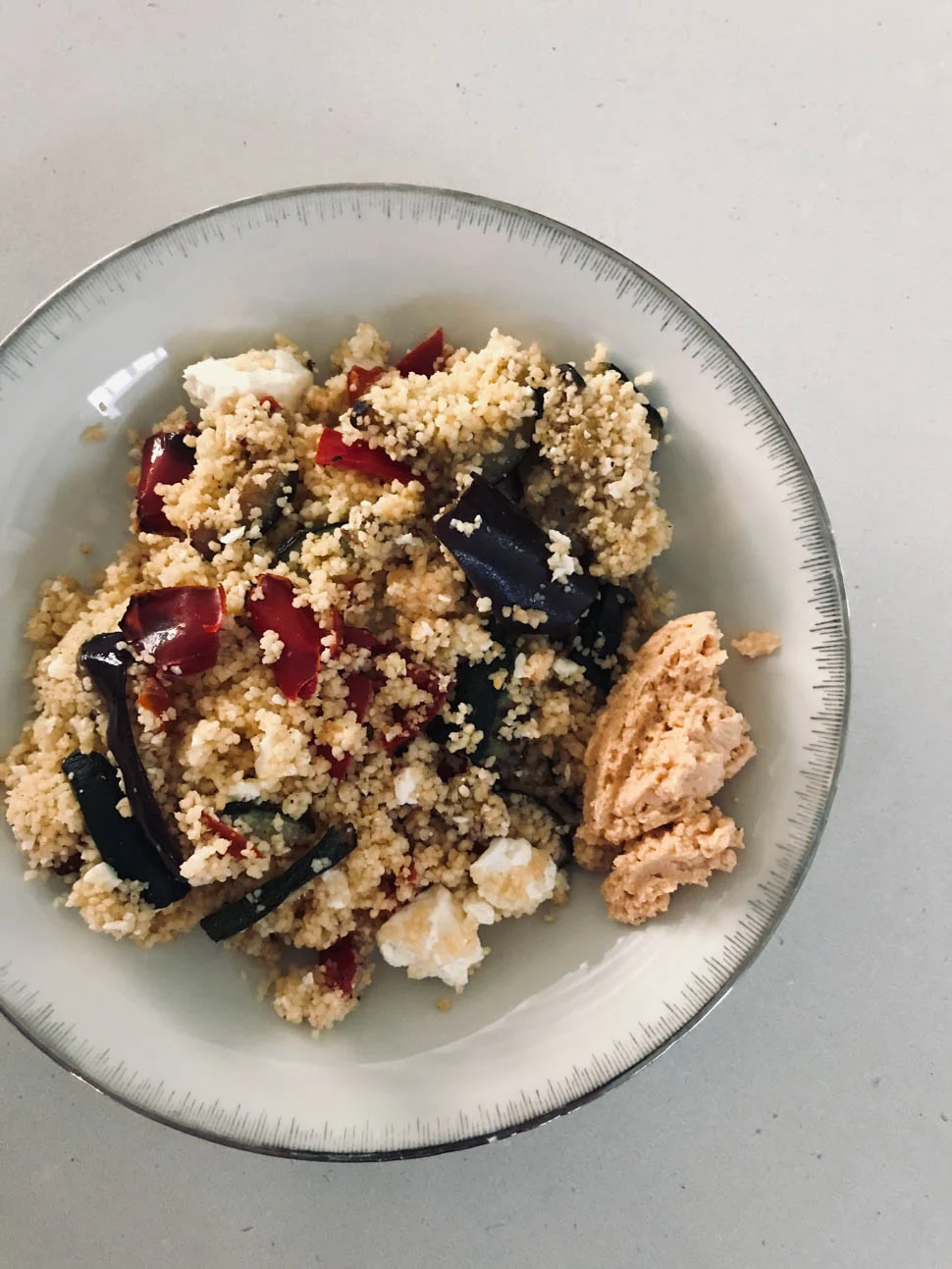 Ik deed woensdagavond even boodschappen bij de Appie en daar neem ik wel een een zak gegrilde groenten uit de diepvries mee. Heel handig voor door een maaltijd zoals dit. Maar ik spotte dus van een ander merk nog meer van dit soort zakken met groenten. En ook zakken met bloemkoolcouscous, courgettecouscous en meer. Ín de aanbieding. Dus je snapt ‘m, ik gooide de mand onder mijn kinderwagen (handig joh) even lekker vol met die zakken. Liggen nu in de diepvries dus daar maak ik de komende week vast iets mee. Maar deze gebruikte ik al; gegrilde aubergine, courgette en paprika. Ik bakte het in een pan op en husselde het door een lading couscous, witte kaas en pittige hummus. Met wat olijfolie, peper en zout een lekkere lichte hap. Ik ging namelijk nog even sporten!