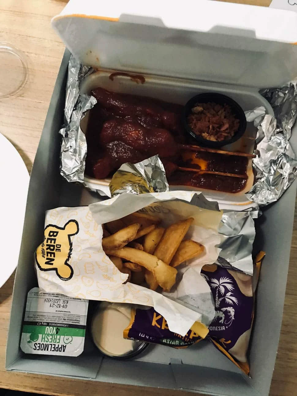We waren zondagmiddag/ begin van de avond op bezoek bij vrienden en onze nieuwe baby-mini-vriendin. Qua tijd waren we er pas einde middag dus we hadden al bedacht dat we eten zouden bestellen. En dat deden we uiteindelijk bij De Beren, een plek waar ik nog nooit gegeten heb of nog nooit eten bij besteld heb. De saté was een aanrader. En ik hou van aanraders dus die heb ik besteld. Was erg lekker met ambachtelijke frieten en een bakkie appelmoes.