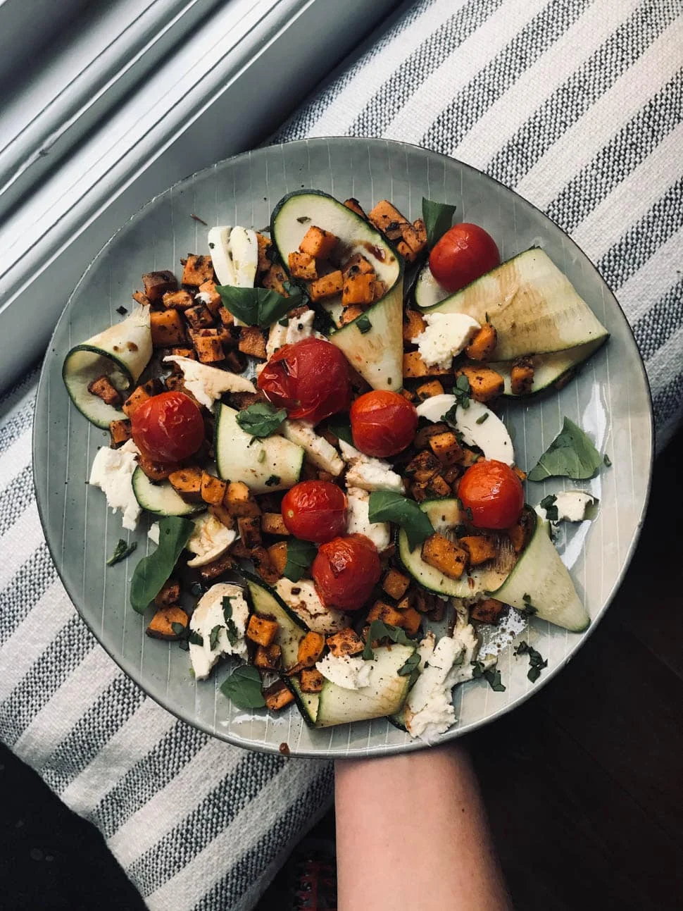 Yes, nieuwe week nieuwe kansen! En eigenlijk stond onze old skool aardappelsalade met dille, mayo en een gekookt eitje op de planning. Had ik toch geen zin in. Dus ik maakte wel de zoete aardappel klaar maar met een Italiaans tintje. Ik roosterde de blokjes in de oven met wat Italiaanse kruiden. Die husselde ik daarna met wat mozzarella, courgette, geroosterde tomaatjes, verse basilicum en een beetje balsamicoazijn.