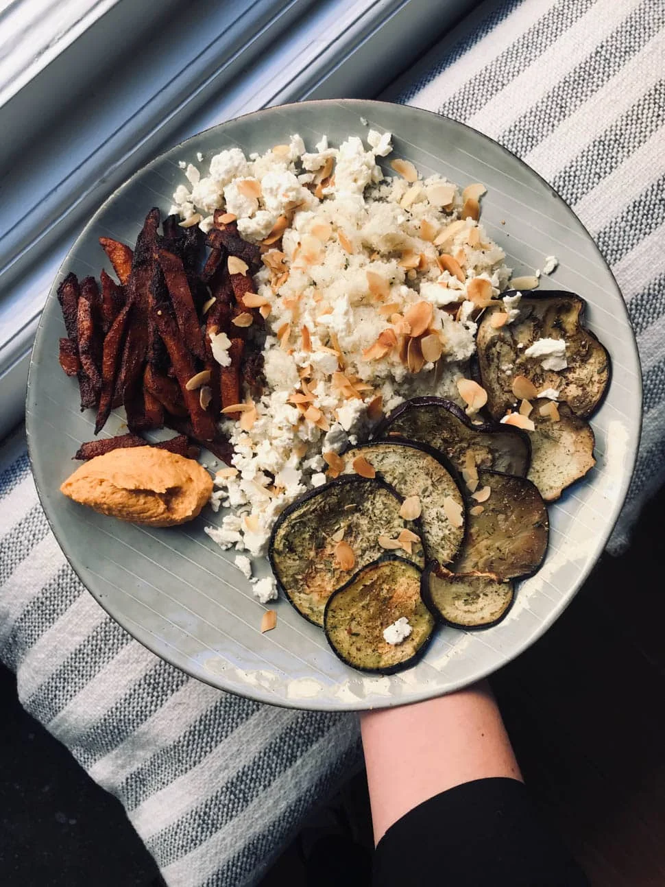Bloemkoolcouscous dus. En het was dit recept, maar dan met een kleine aanvulling in de vorm van zoete aardappelfriet. Die ontdekte ik namelijk nog in onze volle koelkast en had ik achteraf gezien gewoon maandag kunnen gebruiken terwijl ik toen nog speciaal naar de supermarkt ben gelopen om zoete aardappelen te halen. Hoe dan ook, ze moesten op. Dus ik grilde ze in de oven.