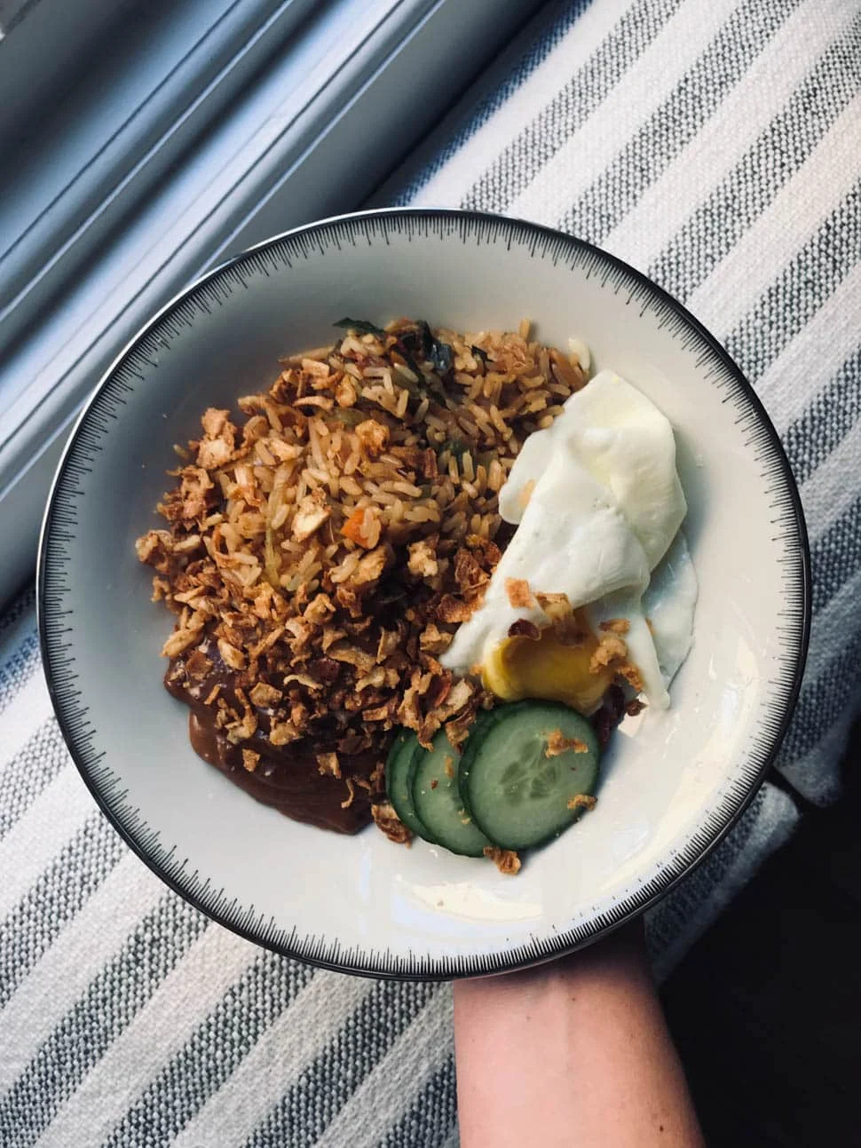 Ik knalde woensdag in een hele korte tijd deze nasi in elkaar. Maar wel volgens het recept hoe ik het het liefst doe; met ui, knoflook, rode peper en verse gember in de foodprocessor vermalen tot een grove pasta en deze even opbakken. Daarna groenten erbij, en gekookte zilvervliesrijst. Nog even goed opbakken op hoog vuur met een beetje ketjap en sambal. Erbij satésaus, komkommer, een gebakken eitje en uiteraard een lading gebakken uitjes.