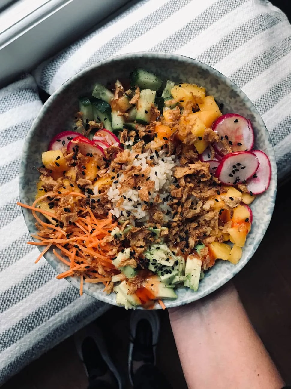 Was alweer even geleden, en ik had er zin in. De zalm wilde ik nog vers bij de visboer halen maar dat vergat ik compleet. Een pokébowl zonder zalm dus, en dat was ook hartstikke lekker. Gevuld met mango, komkommer, avocado, radijsjes, worteljulienne, gebakken ui en zwarte sesam. De zilvervliesrijst mixte ik met een beetje chilisaus en sesamolie.