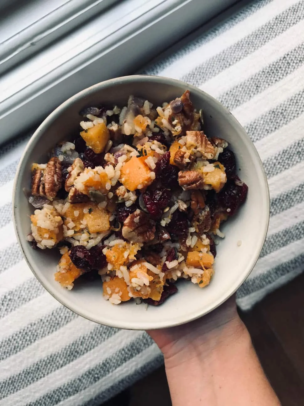 Deze herfstige notenrijstsalade komt binnenkort online. Maakte ik voor OMF afgelopen vrijdag en was gelijk mijn avondeten. Is gevuld met onder andere pompoen, pecannoten en cranberry’s.