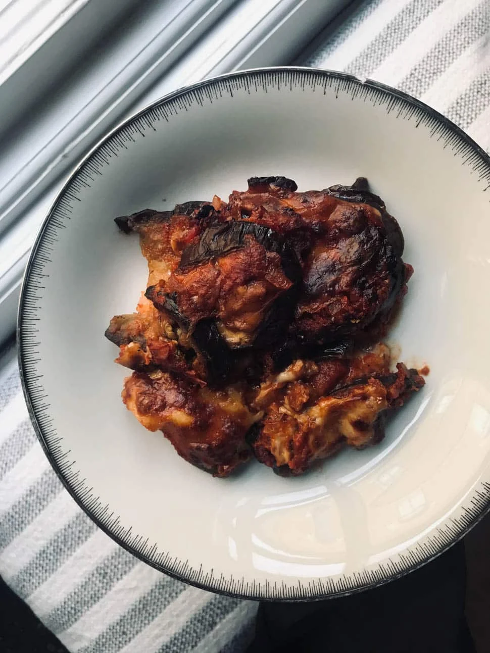 Het ziet eruit als een donkere prut, maar het is zó lekker. Ik maakte Melanzane en die vind ik het lekkerst als die lekker lang heeft staan doorgaren en -bruinen in de oven. Ik maakte drie schalen, twee gingen er leeg.