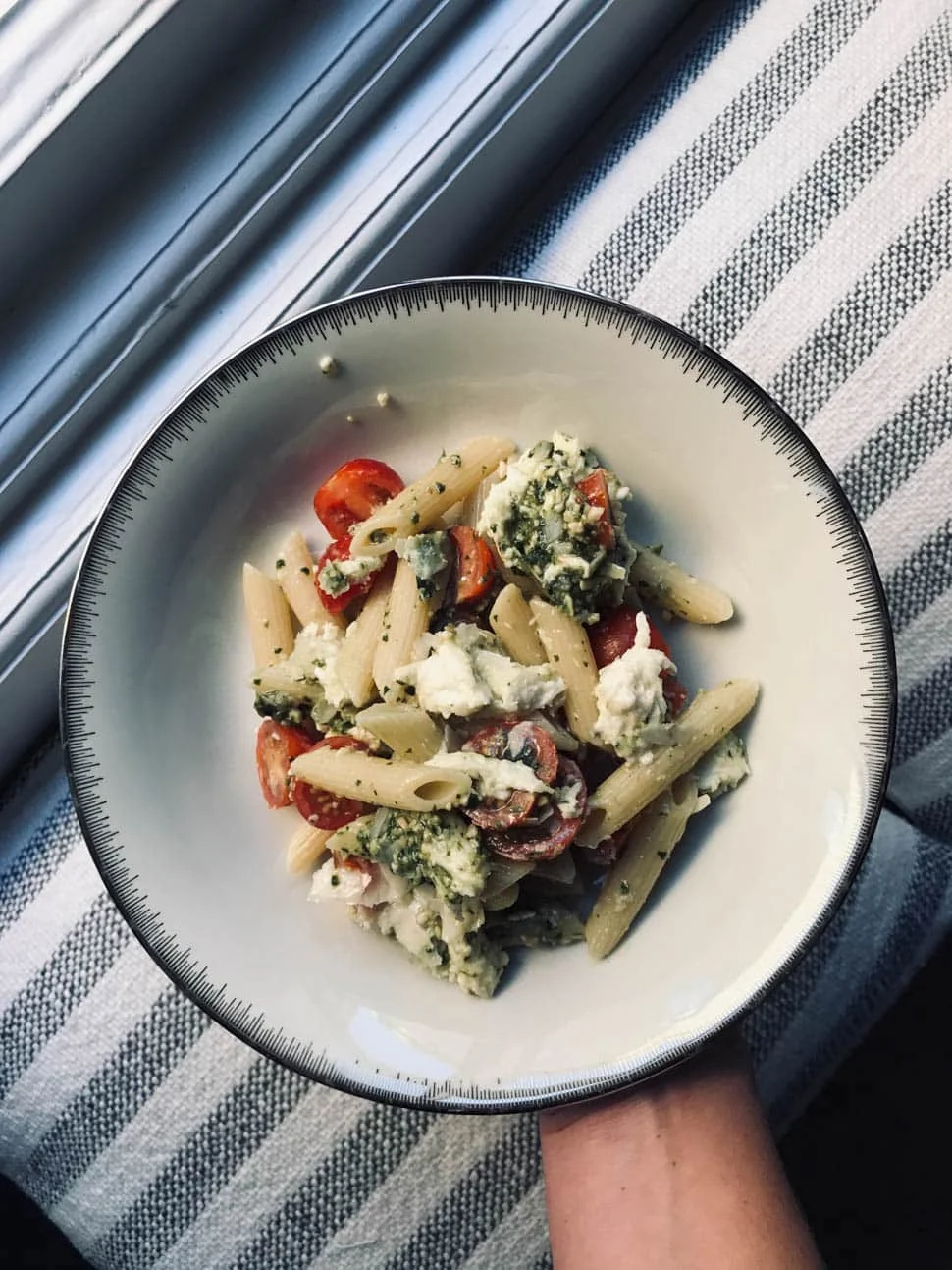 Ik wilde dit warm eten, maar spoelde de pasta veel te lang af onder een koude kraan en dus werd het een koude pastasalade. Veel beter idee! Met pesto, stukken mozzarella en cherrytomaatjes.