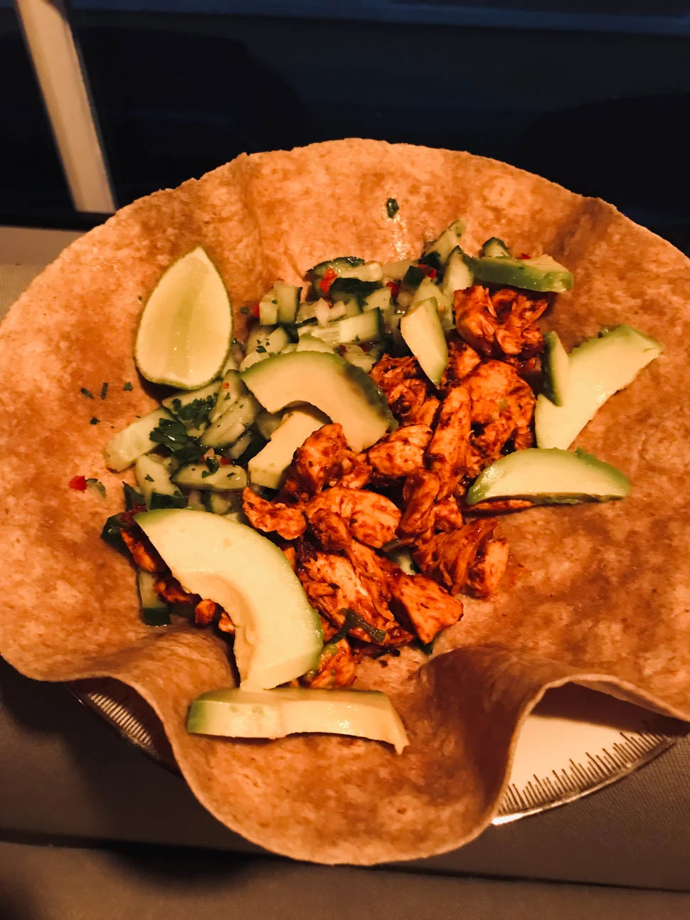 Dit deed Tobias denken aan Costa Rica, en mij ook eigenlijk wel. Dat komt door de salade die erop zit, dat is een mix van rode ui, komkommer, koriander, rode peper en limoen. Ik snij hiervoor dan een ui en denk dan; als ik maar niet teveel ui proef want daar ben ik niet zo’n fan van. En dat valt dus helemaal weg. Heel lekker fris, met pittige kip en avocado op een tortilla.