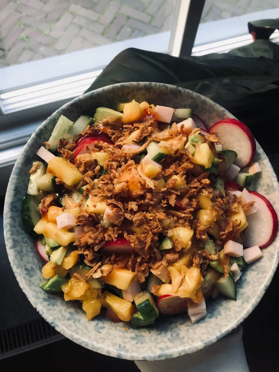Ik kwam thuis en Tobias had al gegeten gaf hij aan. Wat precies weet ik niet maar ik denk dat hij wat in elkaar geflanst heeft. Ik wilde toen eigenlijk gaan maken wat ik ook had bedacht, maar dat zou veel te veel zijn dus ik maakte een poké bowl voor mezelf. Volgestopt met gerookte kip, mango, radijsjes, komkommer, avocado, gebakken ui, sojasaus en chilisaus.