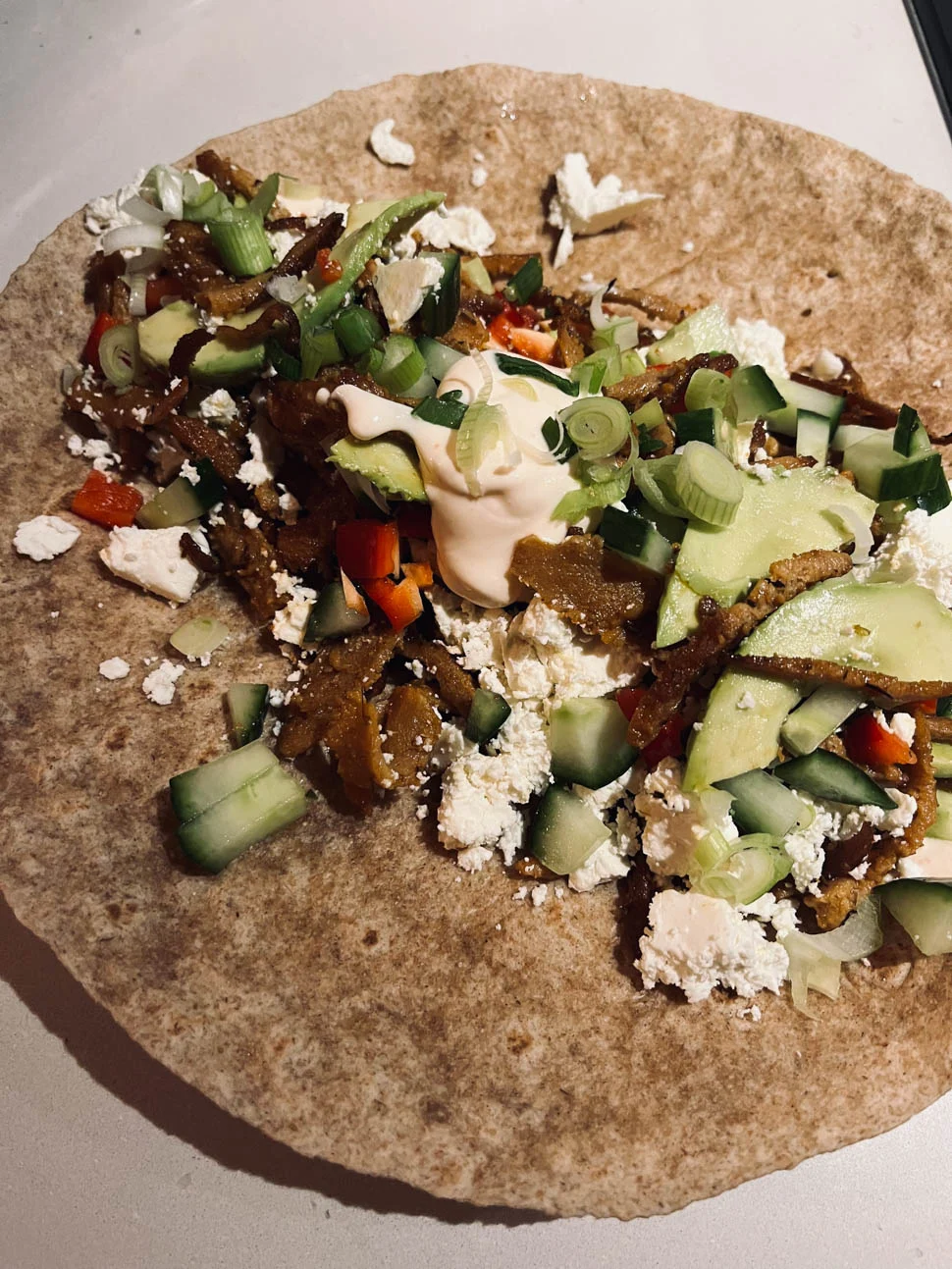 Ik vond dit ook wel een hitje. Ik kocht bij de Appie vegetarische gyros omdat deze in de aanbieding was. Mooi moment om het eens uit te proberen. Het is echt geen gyros moet ik eerlijk zeggen, maar de smaak en de structuur vond ik wel erg lekker. En het deed echt wel aan gyros denken hoor, dus de vibe was er. Zeker met alles wat ik erbij maakte; op een wrap met knoflookyoghurt, zoete puntpaprika, komkommer, bosui en witte kaas. Tobias was minder te spreken over de ‘gyros’, maar ik vond dit in zijn totaal een hele lekkere hap dus ik ga dit zeker vaker maken.