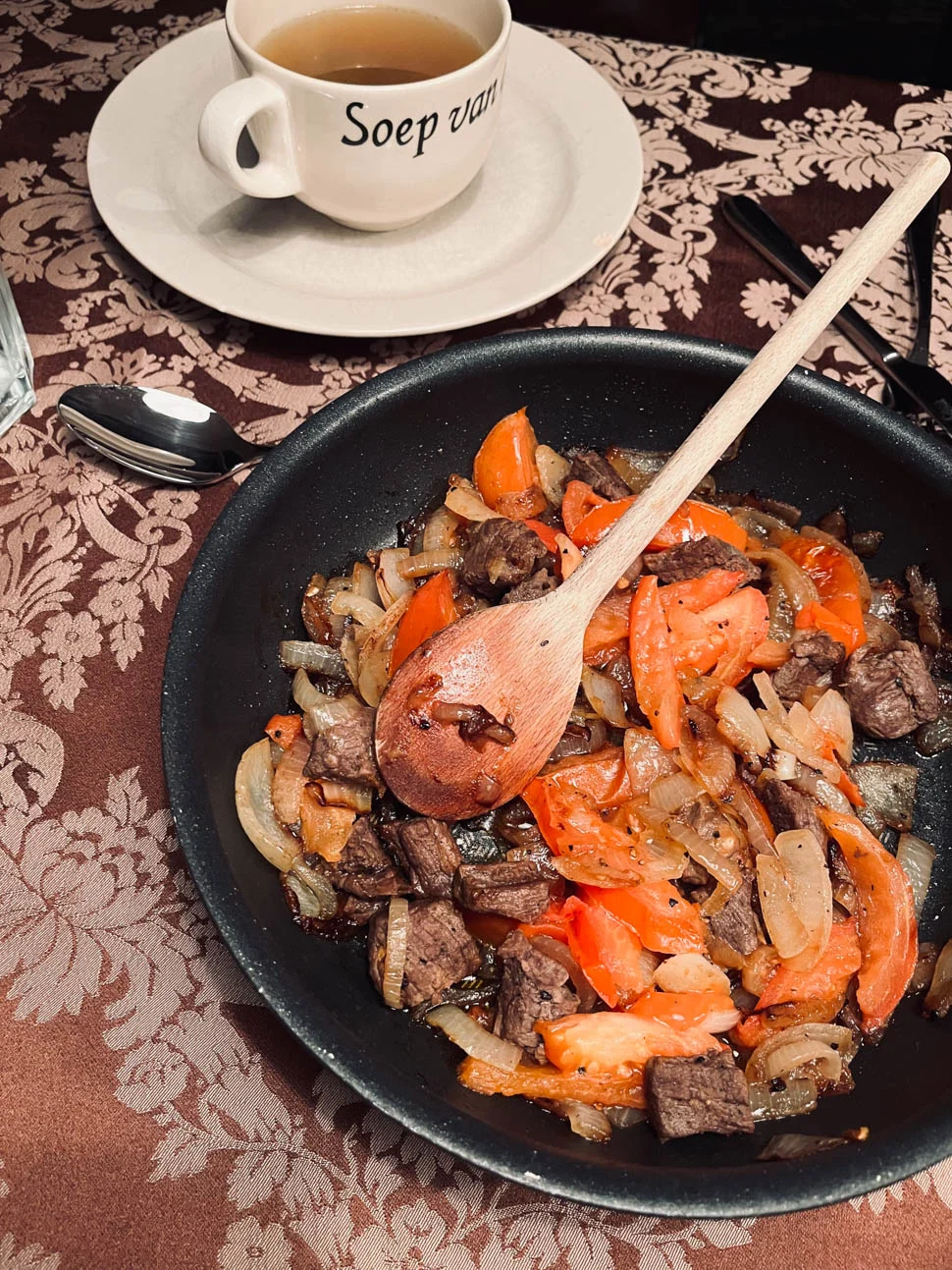 Volgens mij eten veel mensen in het weekend een soepje. Ik hoorde het de laatste tijd ineens veel om me heen en bij mijn ouders is dat ook vaak het geval. Mijn moeder maakte een groentesoep, en voor mijn vader maakte ze dit erbij; gebakken ui, tomaat en biefstuk. Dit is iets wat hij al honderd jaar eet, op wit brood. Is ‘ie gek op. Ik deed gisteren een keertje mee.