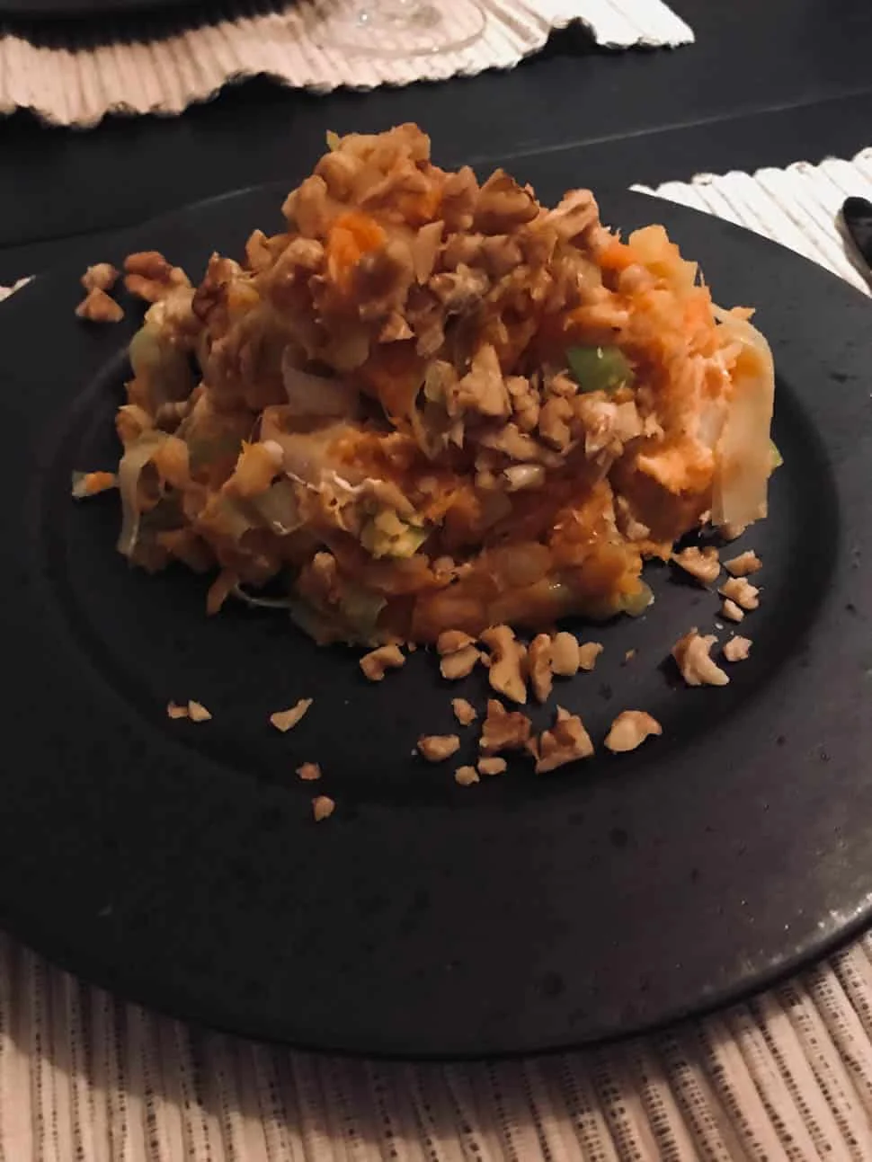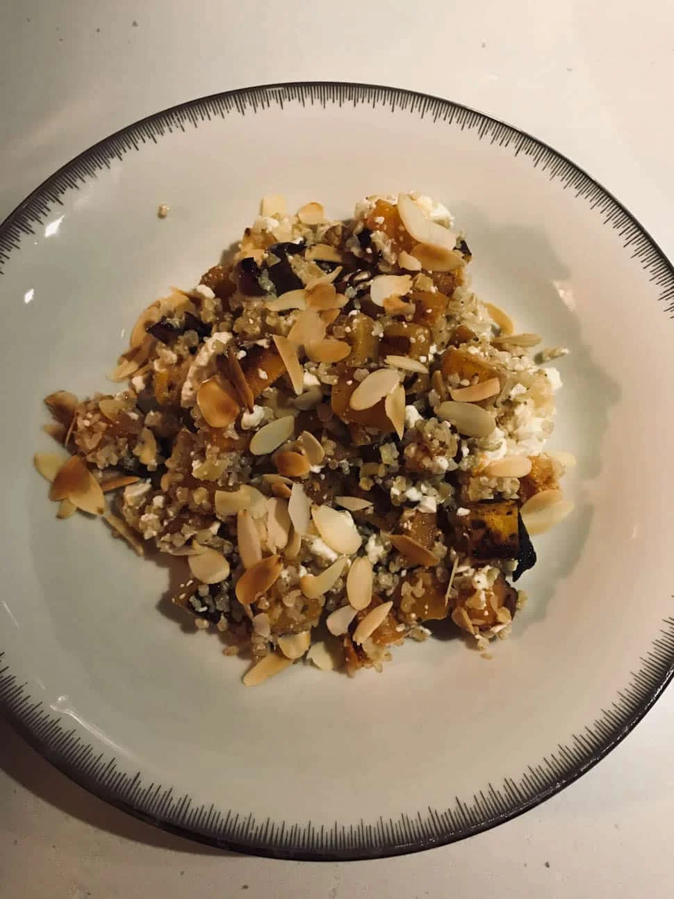 Ik zag net bij het verzamelen van mijn foto’s dat op veel foto’s helemaal niet duidelijk te zien is wat het nou eigenlijk is. Maar goed dat ik er even een korte uitleg bij geef. Dit hier was bulgur, met gebakken pompoenblokjes, witte kaas, gebakken ringen rode ui en wat geroosterd amandelschaafsel. Beetje kruiden erdoor en klaar.