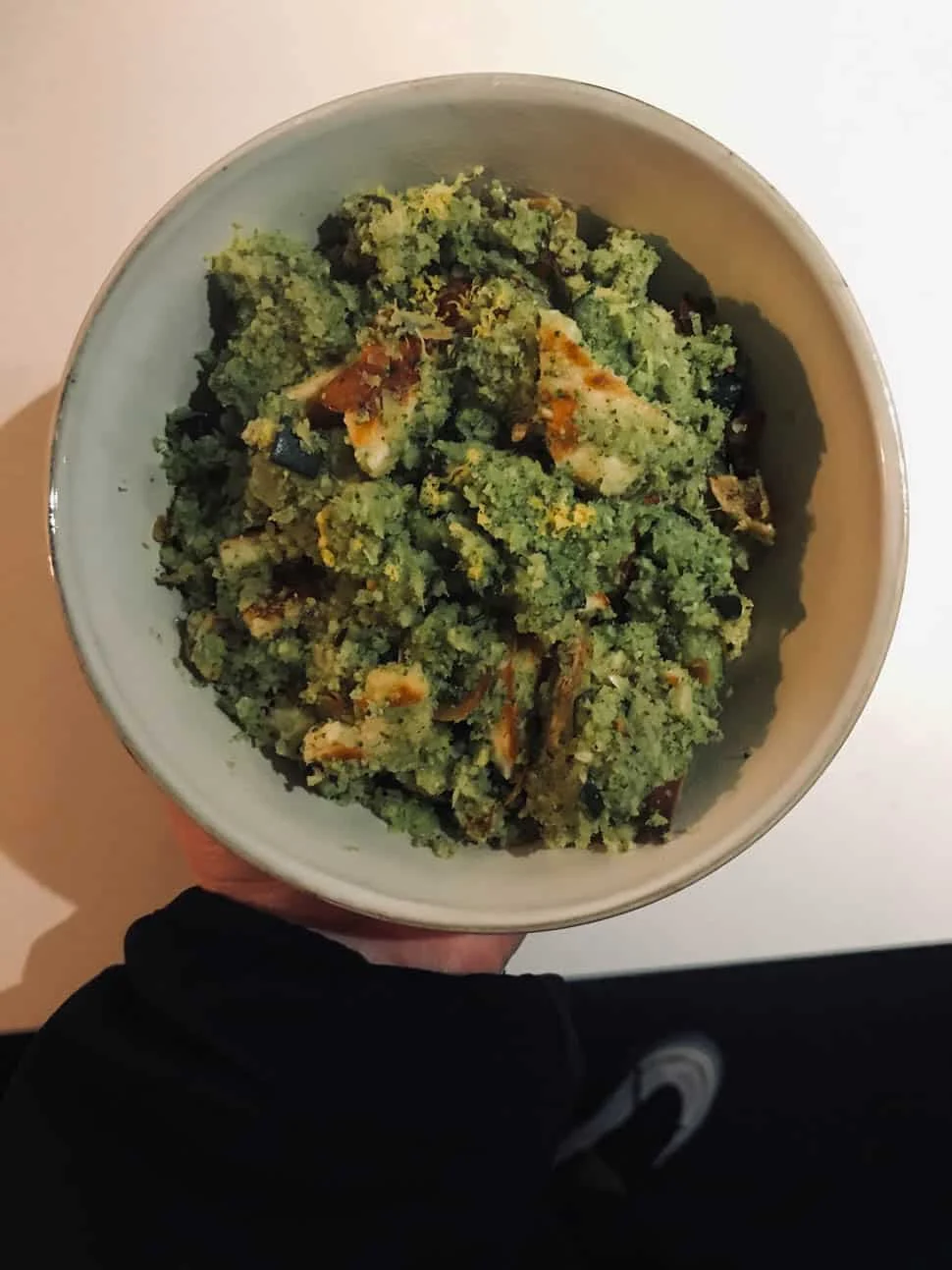 Dit lijkt een bakje stamppot en dat is het helemaal niet. Het is broccolicouscous, met gebakken halloumi, gebakken stukjes courgette, citroenrasp en sap, olijfolie, knoflook, basilicum, peper en zout. Eigenlijk is het in de basis dit recept, maar dan zonder de pancetta. Heel lekker, gezond en licht!
