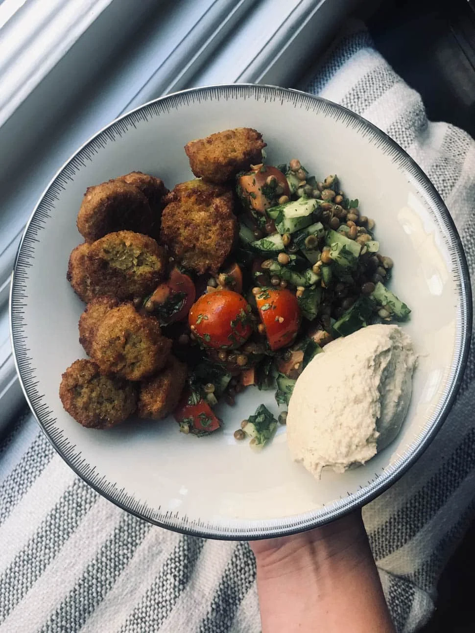 Wij eten allebei wel graag falafel dus dat haal ik zo af en toe in huis. Erbij kun je genoeg maken en deze keer was het een salade van linzen, koriander, munt, komkommer en tomaatjes. Terwijl je de falafel opbakt in de pan, maak je de salade dus dit staat lekker snel op tafel. Ik at het met een flinke lepel humus, maar dit kan ook Griekse yoghurt zijn.