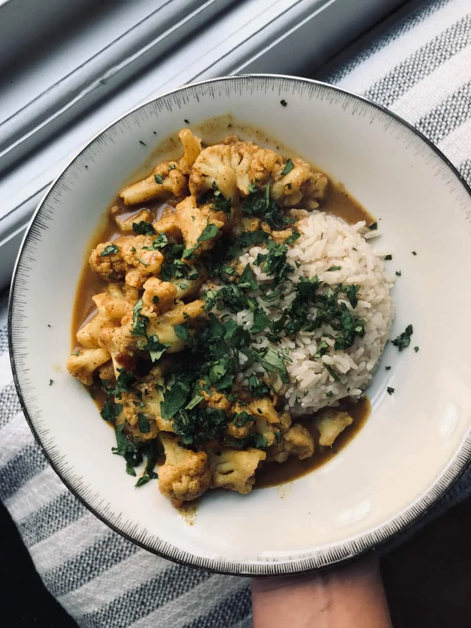 Ik zag ergens een receptje voorbij komen voor een bloemkoolcurry. Een Indiaase welteverstaan en dat wilde ik wel eens proberen. Ik pak namelijk eigenlijk altijd de Thaise curry’s uit het schap in de supermarkt en was benieuwd naar deze. Ik vond het lekker, maar niet zo bijzonder dat ik dit vaker wil maken. Ik at het met zilvervliesrijst en koriander.