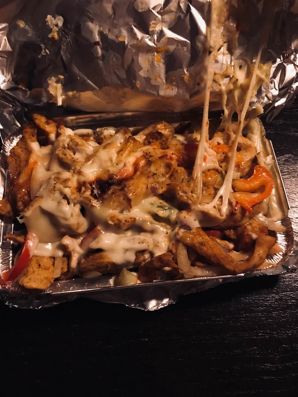 We hadden een heerlijk rustig dagje vorige week zondag, en ik besloot om ’s avonds lasagne te maken. Eentje met wat ingrediënten die we nog in huis hadden, en ingrediënten die ik graag op wilde maken. Een left-over lasagne dus eigenlijk. Maar nee, er werd wat voor me besteld. En dat vond ik ook een príma plan hoor. Ik at deze hele lekkere kapsalon, met gekruide kip, gesmolten kaas en ik denk een soort samba-sausje.