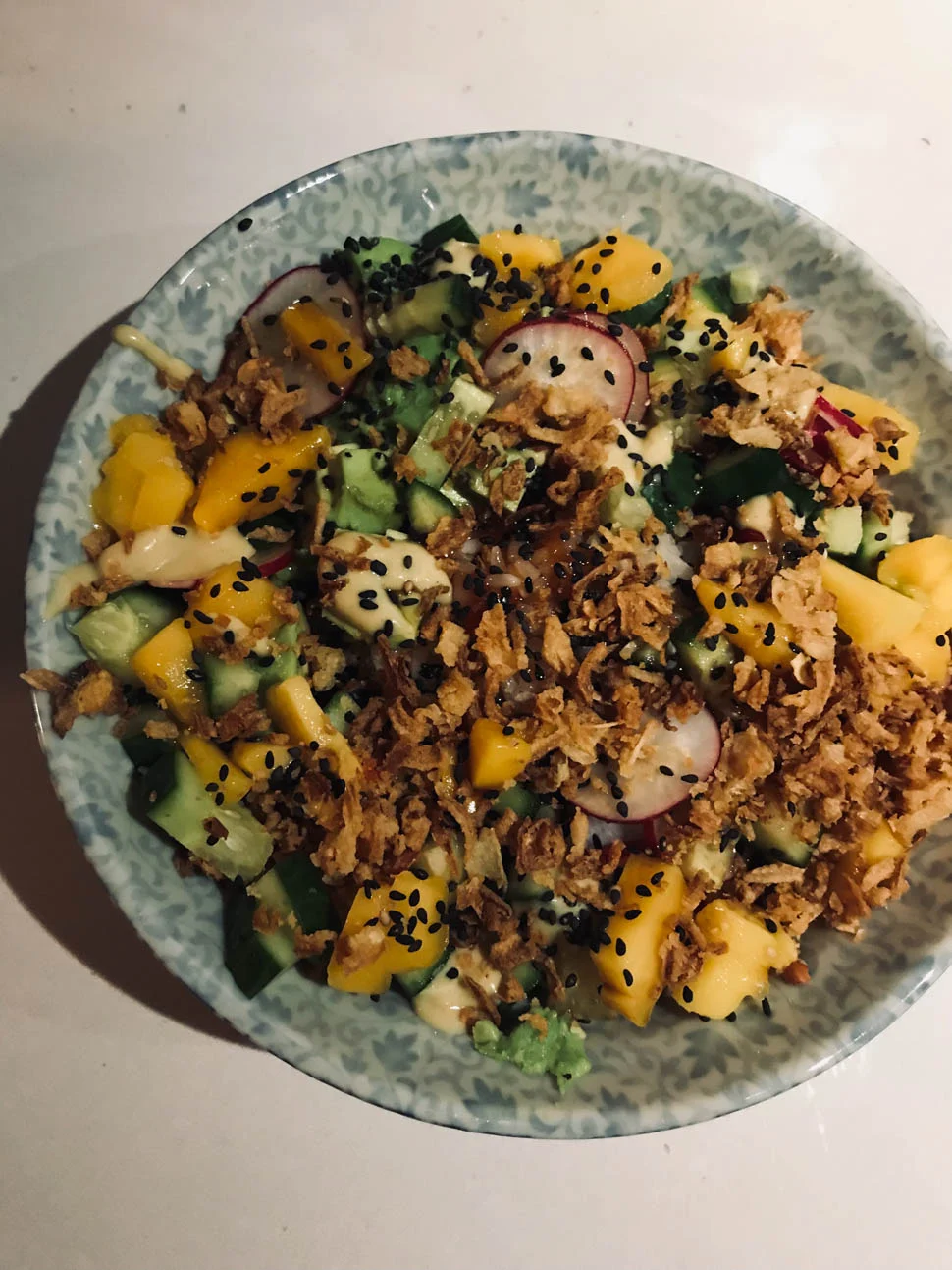 We hadden radijsjes, komkommer, mango en avocado in huis. En dan is het wat mij betreft een hele makkelijke som hoor; daar maken we een bowl van. Ik maak ze altijd met zilvervliesrijst. Gewoon omdat ik dat altijd in huis heb en het is net een tikkeltje gezonder dan andere rijstsoorten (al zijn de witte rijstsoorten natuurlijk superlekker in dit gerecht). Ik gebruikte voor de dressing sesamolie, sojasaus en chilisaus. En ik mikte er ook nog wat dotjes wasabimayo overheen. Flink afgetopt met gebakken uitjes en zwarte sesam. Heerlijk bakje.