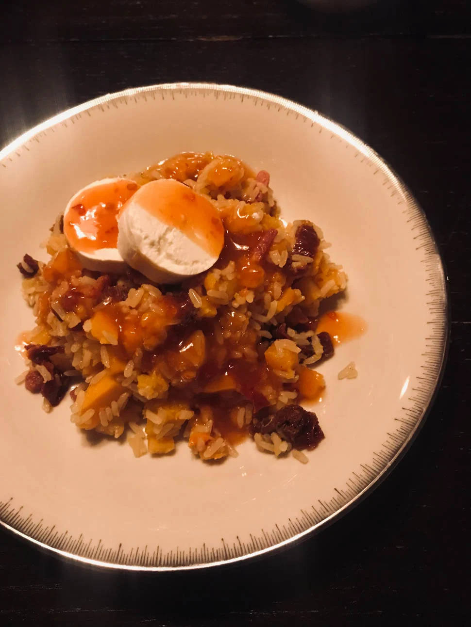 Ik maakte een rijstsalade met pompoenblokjes die ik eerst even kookte, en daarna nog even op hoog vuur bakte voor een lekker gebakken smaakje eraan. Er gingen ook stukjes zongedroogde tomaat en geitenkaas doorheen, en erover deed ik wat van een mengsel sesamolie/chilisaus. Prima doordeweekse hap.