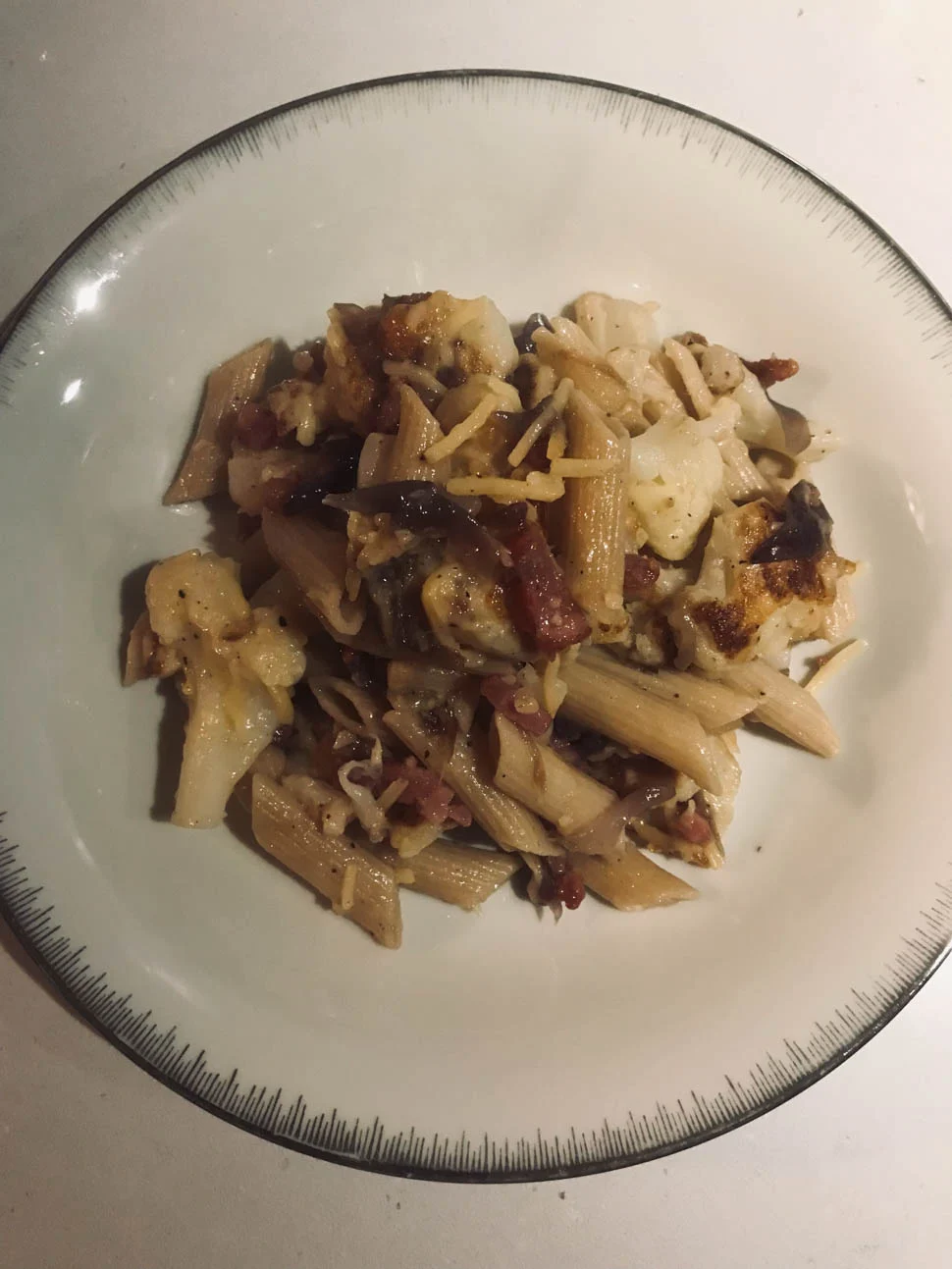 Dit was een uitprobeersel en hoewel je misschien denkt; hmmm… wat vinden we daarvan? Kan ik je zeggen dat het lekker was! Dit is pasta met bloemkool. En die bloemkool kookte ik eerst kort, en bakte ik daarna op hoog vuur mét wat geraspte kaas. Dat bakte lekker krokant. Verder nog wat gebakken spekjes erdoor en na het husselen van alles nog een beetje kaas erdoor. Het was veel, dus we aten er vrijdag ook nog van.