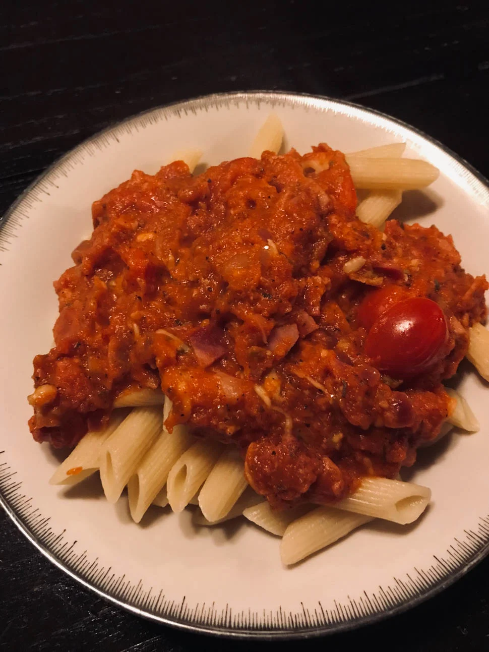 Vorige week waren we bij mijn ouders vanwege Sinterklaasavond en toen vertelde mijn schoonzus dat ze deze pasta altijd maken als ze niet weten wat ze moeten eten. Grappig, want dat doen wij ook. Omdat het een heel simpel recept is en omdat het héél erg lekker is. Ik deelde het recept ooit met mijn broer en schoonzus en sindsdien is het een recept wat dus met regelmaat op tafel staat in 1 van de huishoudens. Wij hadden er zondag heel veel zin in, en ik maakte dan ook bewust een hele volle pan met saus en kookte genoeg penne zodat we er nog een dag van zouden kunnen eten. Penne dus, met een saus van Tomato Frito, knoflook, ui, gebakken ham, veel kaas, cherrytomaatjes en wat Italiaanse kruiden.