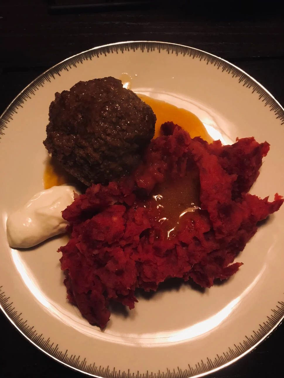 Maandag was mijn moeder weer bij ons om een middagje op Louie te passen en om voor ons allemaal te koken. Hollandse pot is waar mijn moeder de beste in is (en waar ik mee opgegroeid ben dus al deze gerechten at ik vroeger thuis al). Ze maakte op ons verzoek deze keer een krotenprakkie. Kroten is Rotterdams voor rode bietjes. Ik kwam erachter dat veel mensen het niet kennen; ik weet niet beter ;-) Maar dit prakkie was heerlijk, met een joekel van een (pittige) gehaktbal zoals je ziet, en lekker wat jus. Overigens at ik dit vroeger met een laagje mayonaise erover. Had ik nu niet zo’n behoefte meer aan, wel een dotje bij de gehaktbal.