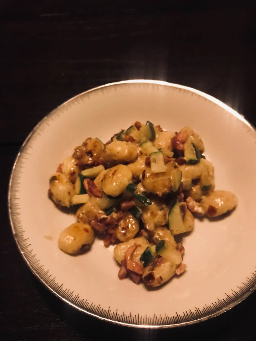 Oeps, wazig fotootje. Maar dit was een heel lekker bordje gnocchi met gebakken courgette erdoor, en een rood uitje bakte ik ook even mee. Verder wat kruidenboter voor ‘romigheid’ en wat spekjes. Dit staat echt binnen 10 minuten op tafel, en is ook zó op. Een lekkere snelle hap.