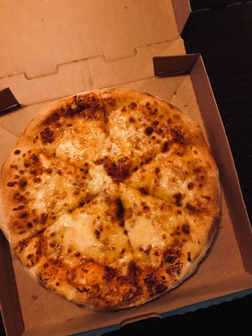 Ik gaf vrijdagochtend twee ochtendlessen (en trainde mee) bij de Barbell Club in Apeldoorn, en daarna haalde ik Louie op, gaf hem de fles en liet hem even lekker dutten. Ondertussen douchte ik, ging ik even naar een paar kringloopwinkels en pikte ik Louie vervolgens thuis weer op om even met hem een rondje door de stad te banjeren – zo fijn dat we in het centrum wonen – voor de laatste kerstcadeau’s. En wat ben ik blij dat ik dat laatste vrijdag nog even gedaan heb, want die harde lockdown hè… We zijn er weer. Lekker binnen zitten. Nou ja, hoe dan ook, toen ik rond half 6 thuis was, was de zin om nog te koken even verdwenen. Ik was het van plan hoor, echt. Had ook echt wat lekkers bedacht. Maar ik vond het ook een heel goed idee om pizza te bestellen. Ik at deze vier-kazen pizza, was lekker!