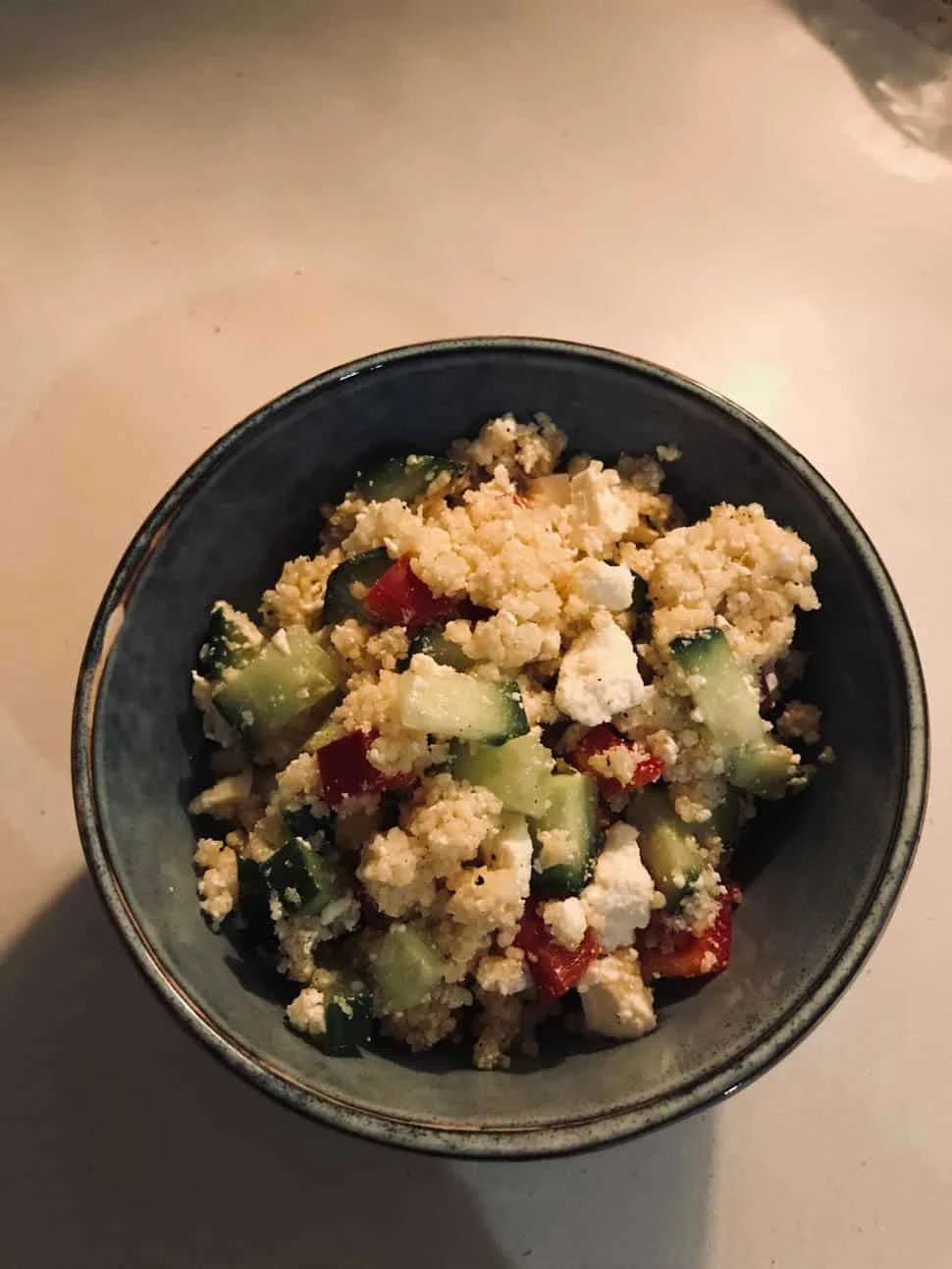 Vrij weinig zin om uitgebreid te koken woensdag, en veel zin in een lichte couscoussalade. Eentje die ik vaker maak met rode paprika, komkommer, witte kaas en citroen.