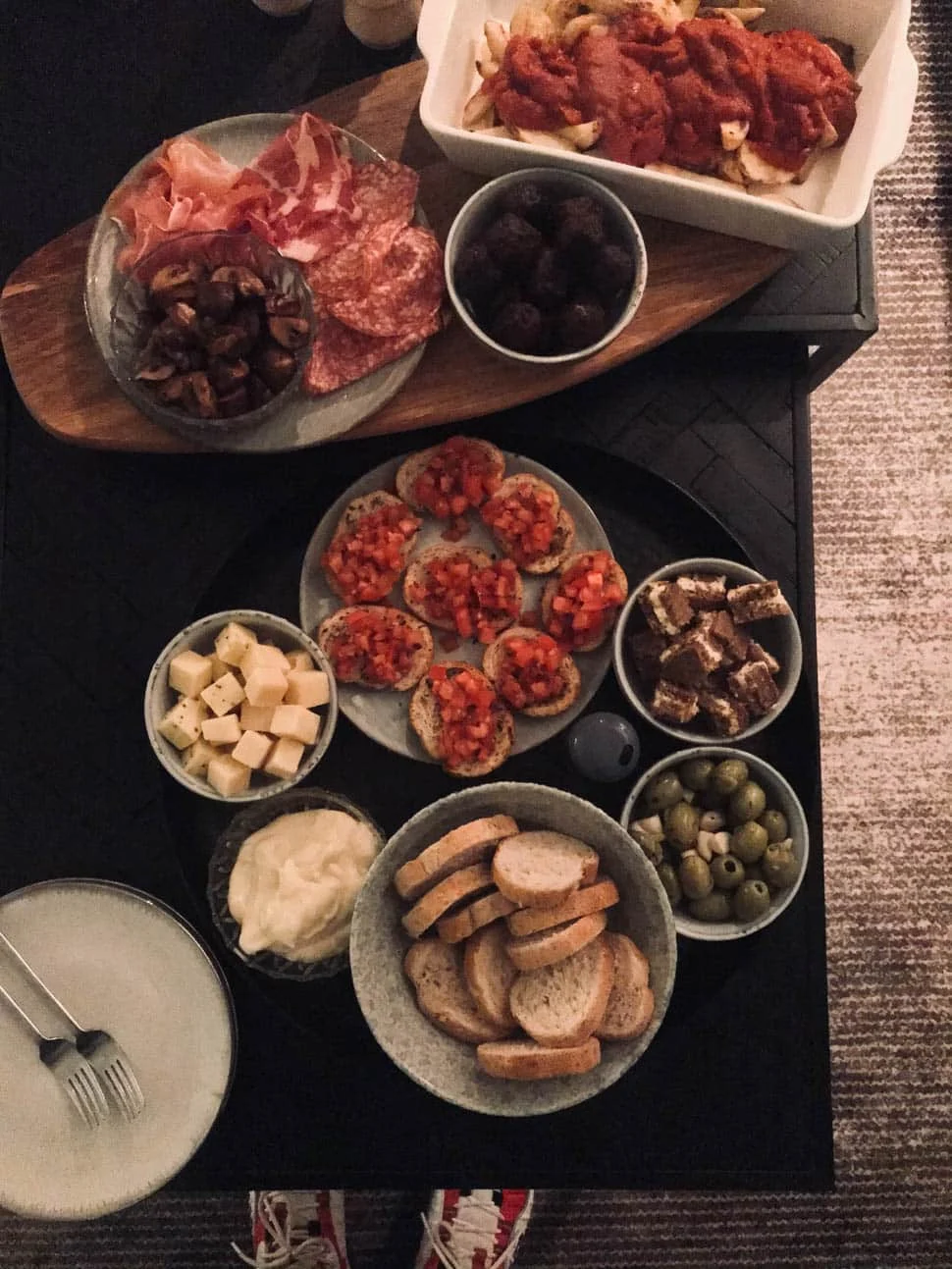 Tobias en ik vierden 1e kerstdag samen en ik dook de keuken in om wat tapas te maken. Ik maakte gehaktballetjes, patatas bravas, knoflook/balsamico champignons en bruschetta’s. Dat vulde ik aan met olijven, aioli, blokjes kaas, hammen en blokjes roggebrood met kaas. Was veel te veel, we eten er nu nog van ;-)