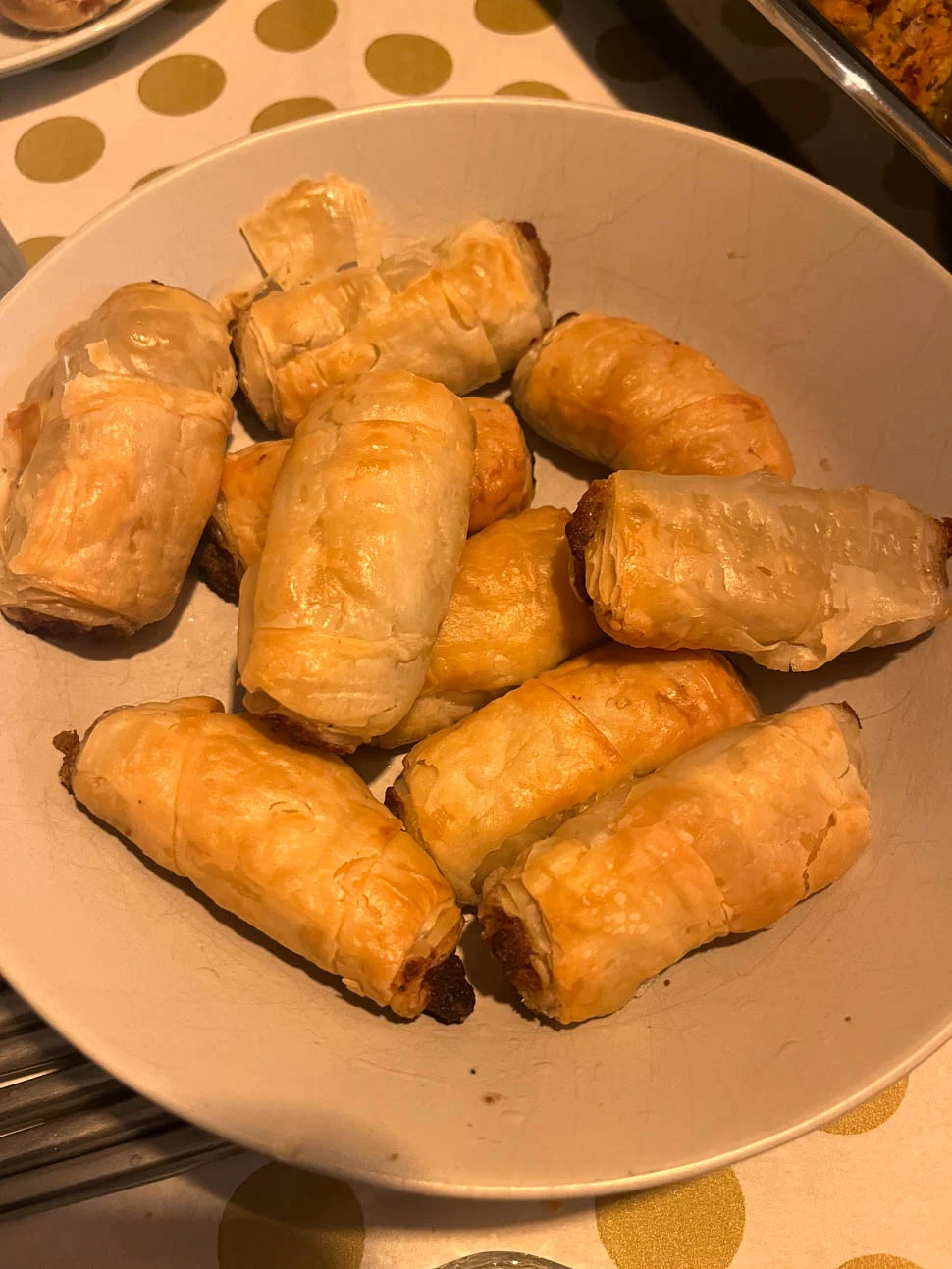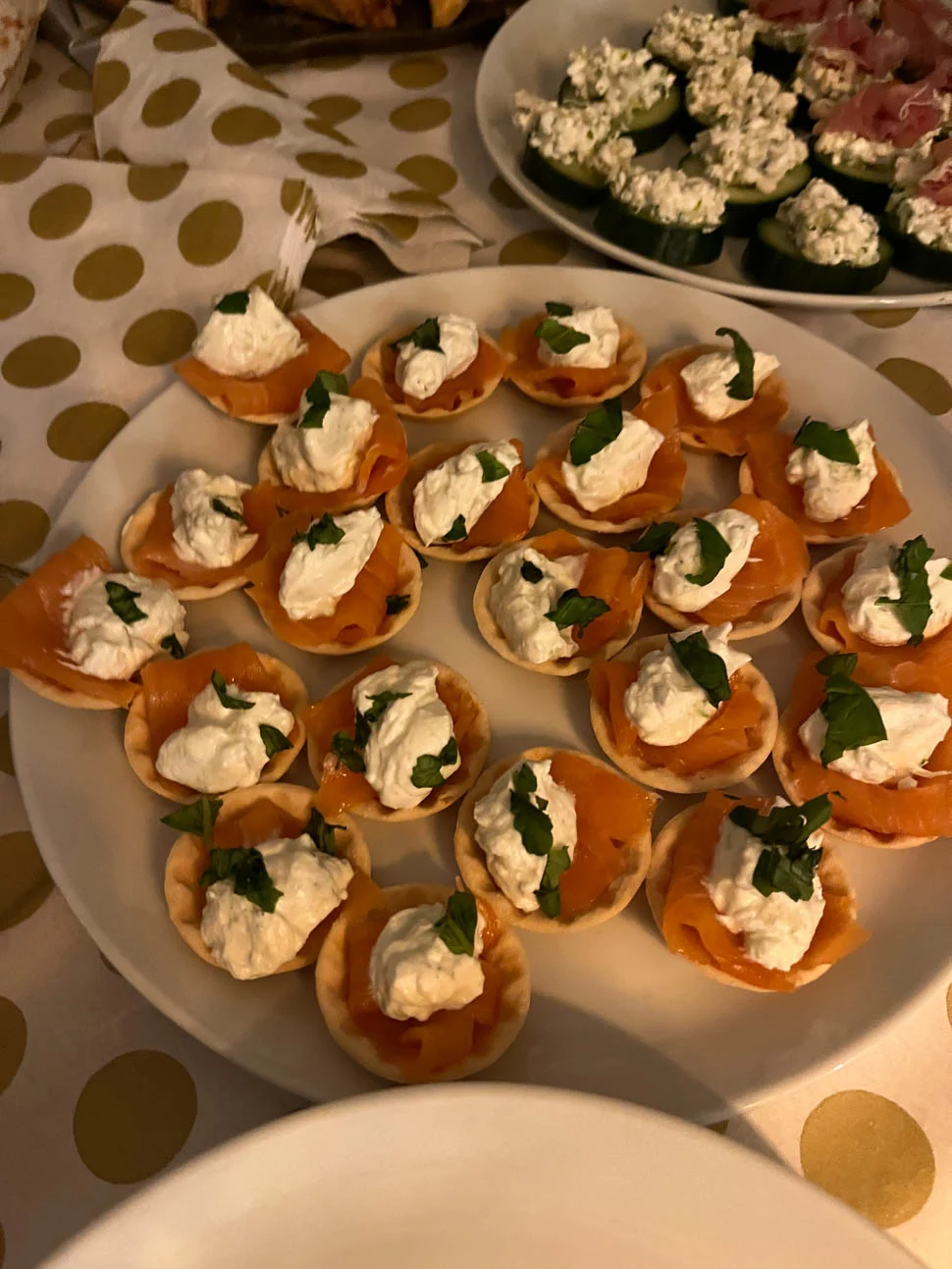 Een lekker flatteuze foto van deze pizza. Die we toch nog maar even in de oven stopten voordat we naar vrienden gingen voor een gezellige laatste avond van het jaar. Ik gokte dat die pizza dus niet nodig was, omdat ik en nog een paar hapjes zouden maken. En dat bleek inderdaad zo te zijn. De tafel stond bommetje vol: