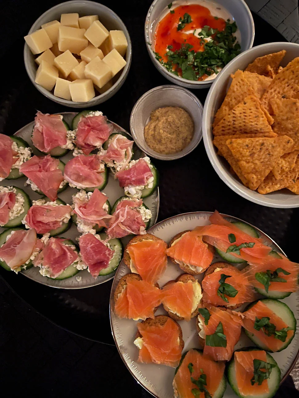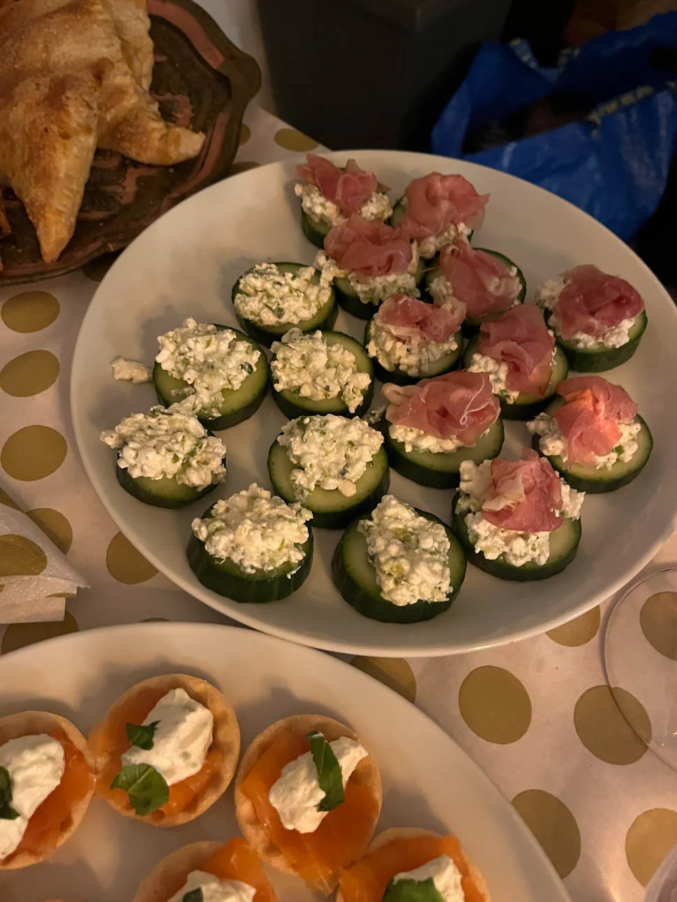 En deze komkommerschijfjes met bosui-cottagechees spread en rauwe ham (en zonder ham voor de vegetarische mensen). Verder ook nog nacho’s met Gooische dip, en wat andere kleine snacks, maar daar is geen beeldmateriaal van.