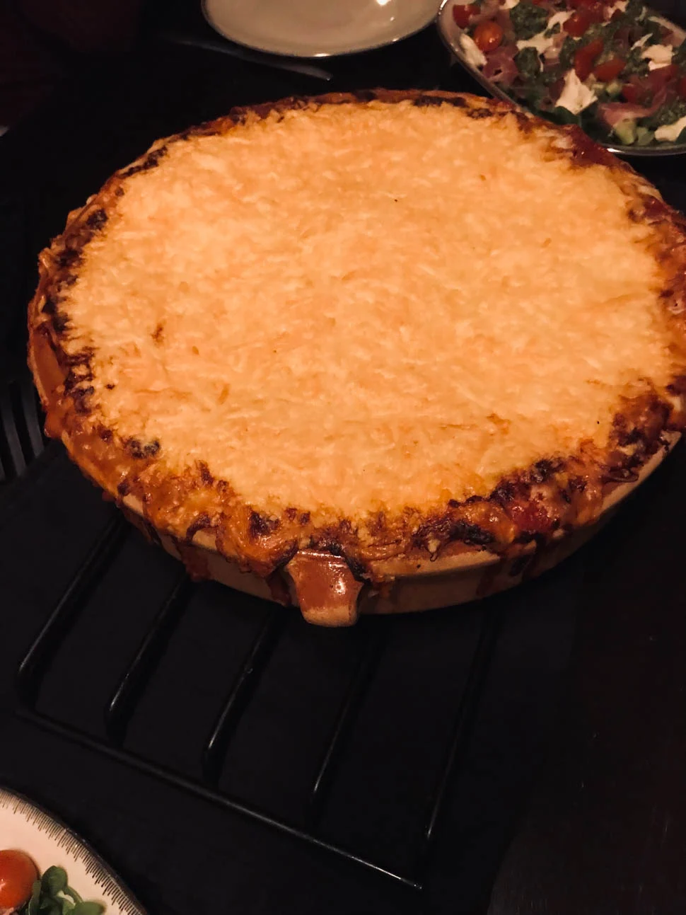 Vorig jaar maakte ik de lasagne die Tobias’ moeder altijd maakte en waar ze bij hem thuis gék op waren. Ik maak die lasagne bijna nooit maar om het met Kerst te maken vond ik een goed idee. Dit jaar deed ik dat dus weer, en zoals je misschien ziet was het een méga schaal. Erbij maakte ik een lekkere salade met pesto, Parmaham, mozzarella en tomaatjes. We kregen die dag van mijn moeder nog een portie mierzoete appelmoes mee dus die ging ook op tafel en vriend Jordy maakte lekkere stoofpeertjes voor erbij. Al met al een lekker feestmaal!