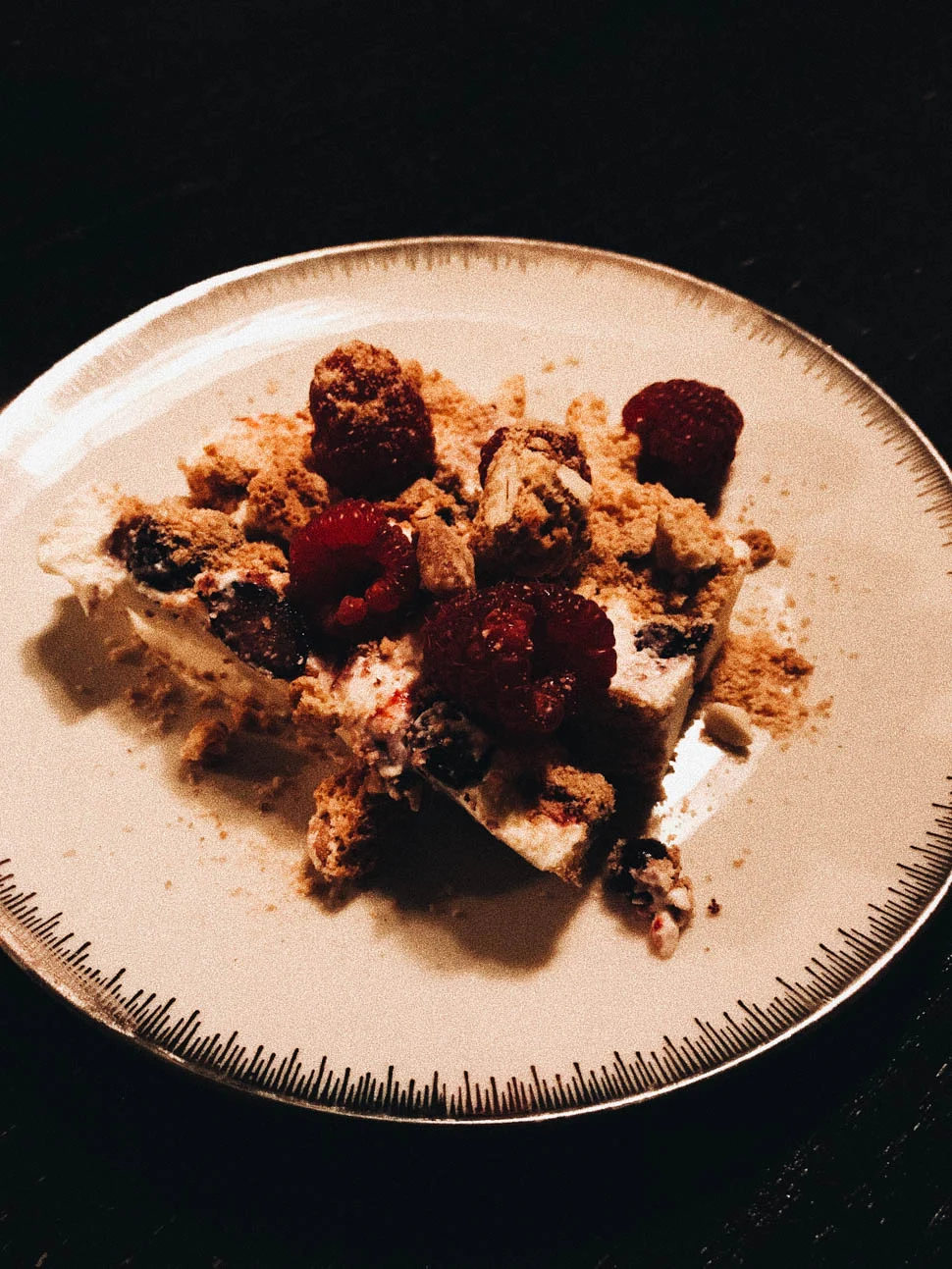 De lasagne was niet heel ingewikkeld om te maken, de salade ook niet. En dat hoeft natuurlijk ook niet maar ik had wel zin om even iets leuks te maken voor het nagerecht. Ik dook ’s middags dus al de keuken in om deze Semifreddo te maken. Een Italiaans dessert, een soort layer-cake, op basis van ‘bevoren’ room/mousse. Het leuke is dat het namelijk niet echt bevriest dus je kunt het direct uit de vriezer serveren. Deze variant bevatte rood fruit, cantuccini koekjes en verse frambozen. Heel erg lekker.