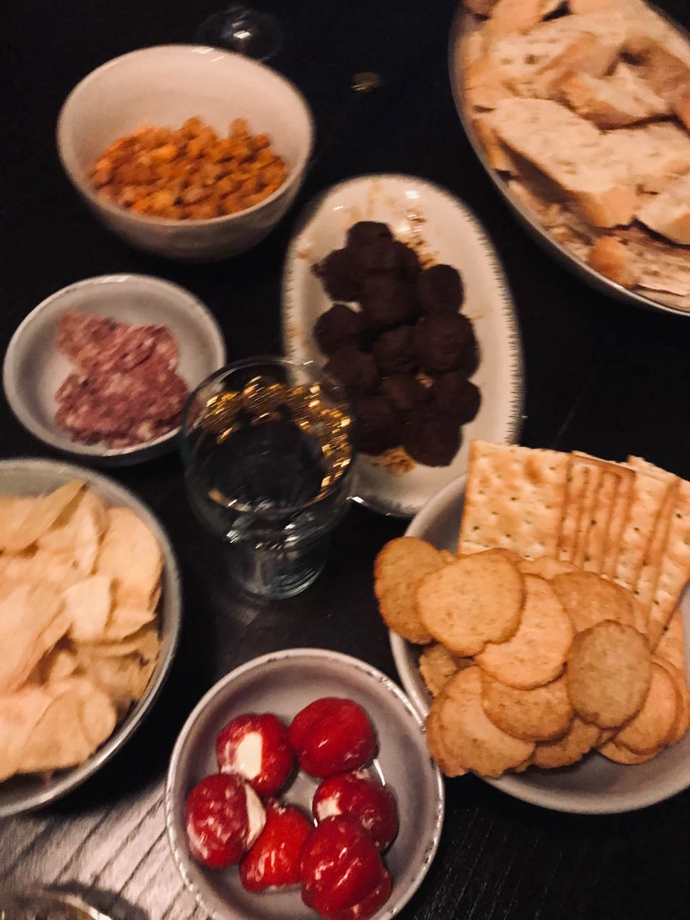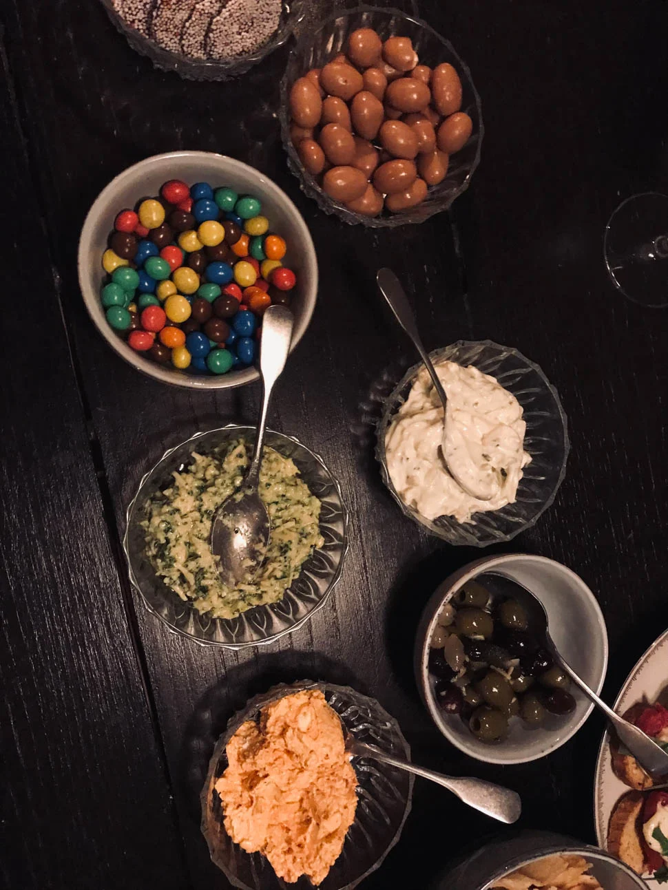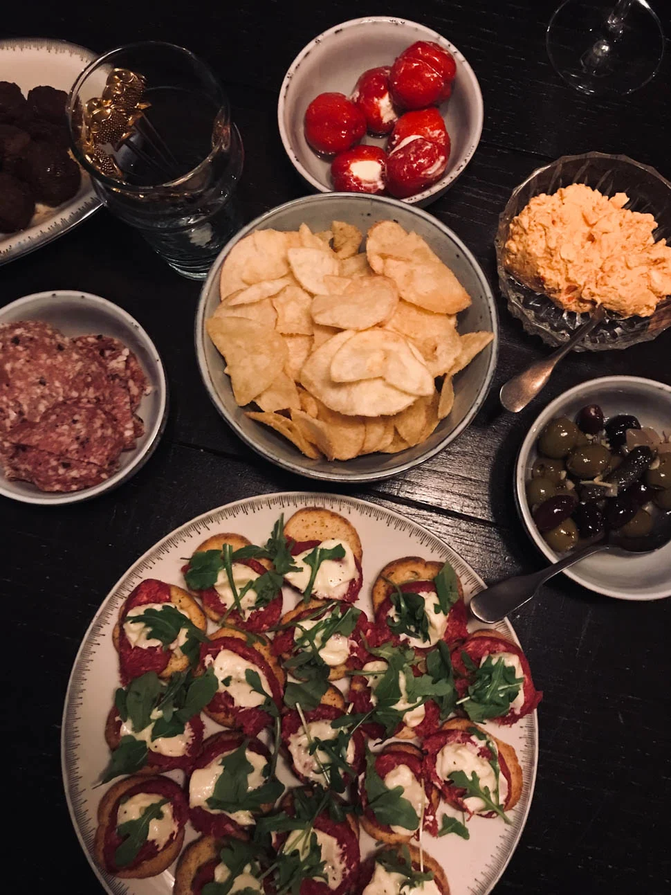 Wij besloten Kerst nog even te verlengen met vrienden die kwamen borrelen. We spraken af allemaal wat lekkers te maken/mee te nemen. De mannen zorgden voor de speciaalbiertjes, wij voor de hapjes. Ik maakte ketjap gehaktballetjes en toast met ossenworst, truffelmayo en rucola. Een hit die laatste, altijd. Verder wil ik je nog even de amandelen met gezouten karamel-laag tippen, van de Appie zijn ze. En alhoewel ze in het feestassortiment zitten (noteer dit dus voor volgend jaar), hoop ik dat ze in het gewone assortiment komen want DIE ZIJN ME TOCH LEKKER. Verder waren er lekkere nootjes, smeersels, toastjes, olijven, M&M’s en eigenlijk gewoon alles waar we zin in hadden.