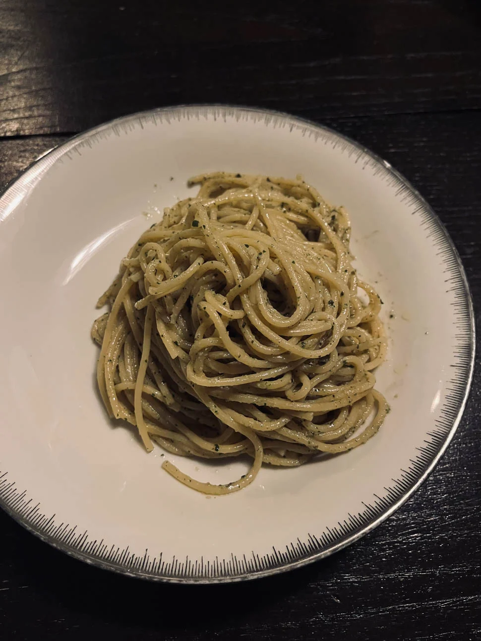 Hier had ik zin in. Spaghetti met ansjovis, knoflook en basilicum. Ik maak het niet vaak omdat Tobias het niet zo lekker vindt, maar ik had alles ervoor in huis en de ansjovis wilde ik graag even op maken. Dus ik fabriceerde dit bordje in 10 minuten in elkaar.