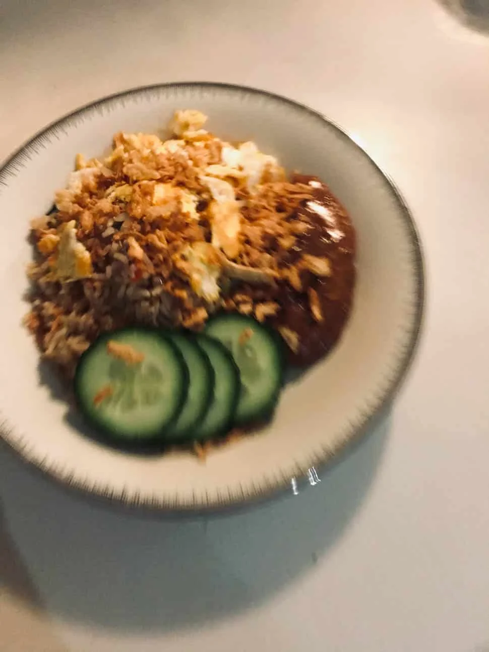 We werkten zondag onze left-overs weg. Tobias ging voor de lasagne en ik voor de nasi. Dus inderdaad, dit is dezelfde wazige foto als vorige week. Maar een lekkere hap in ieder geval, met satésaus erbij, komkommer en gebakken uitjes. Overigens maak ik de basis (smaakmakers) voor nasi altijd van een rode peper, rode ui, knoflook en verse gember.