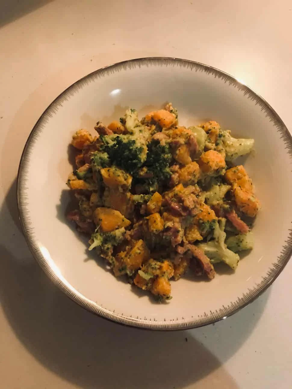 Wij hebben een periode gehad dat we heel vaak deze zoete aardappelsalade aten. Heel simpel; zoete aardappel in blokjes gebakken of geroosterd. En erdoor een dressing van mayonaise, citroensap en dille. Deze keer deden we er gebakken spek en gekookte broccoli door.