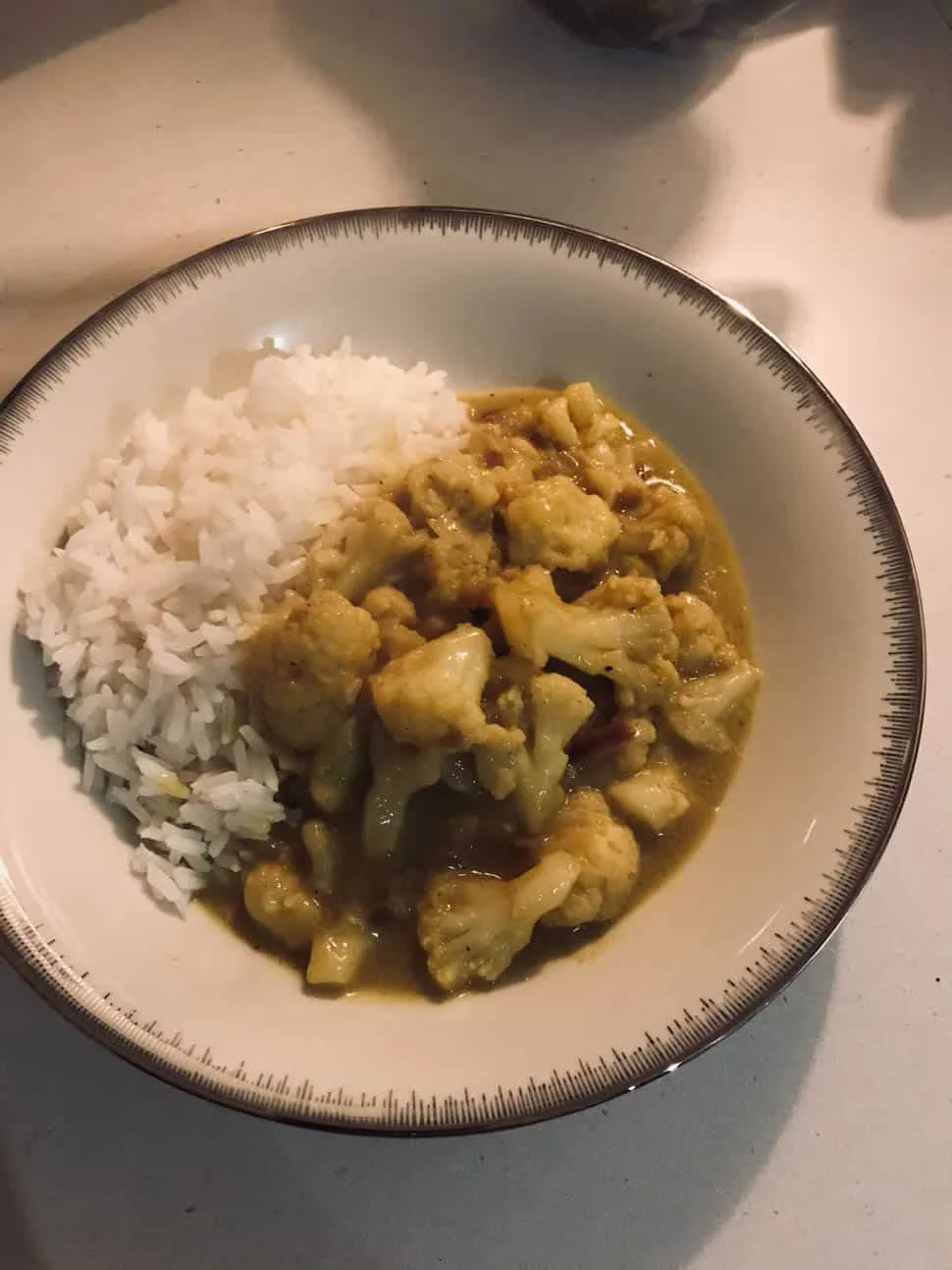We hadden een aangebroken pak pandanrijst staan en hoewel zoiets heel lang goed is, stop ik rijstsoorten, couscous en meer van dat spul altijd in grote potten die we in een grote keukenla hebben staan. Hier had ik dus geen pot meer voor dus ik wilde het graag opmaken. Met bloemkool en een kerriesaus die ik maakte van kokosmelk, gebakken ui, knoflook, verse gember en uiteraard kerriepoeder. Heel makkelijk en ook een niet al te zware hap.