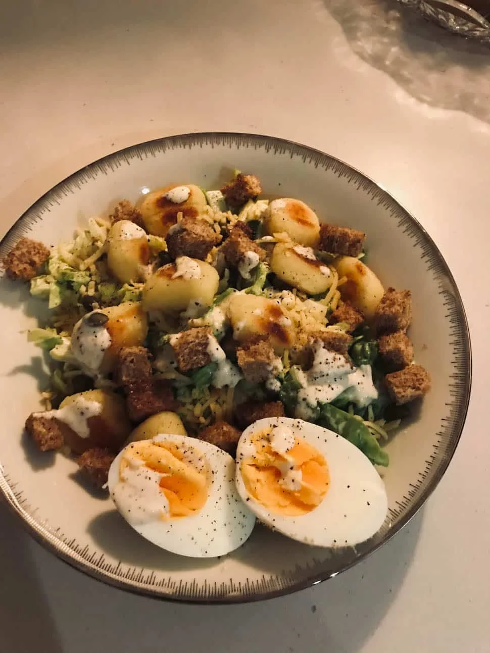 Ik had wel weer eens zin in een Ceasar Salad en hoewel ik die altijd met ansjovis maak, was ik die even vergeten in huis te halen. Ik maakte er deze keer wel meer een maaltijdsalade van door er gebakken gnocchi aan toe te voegen. Door deze maaltijd kreeg ik zin om weer vaker dit soort gerechten op de planning te zetten dus dat is wat ik ga doen.