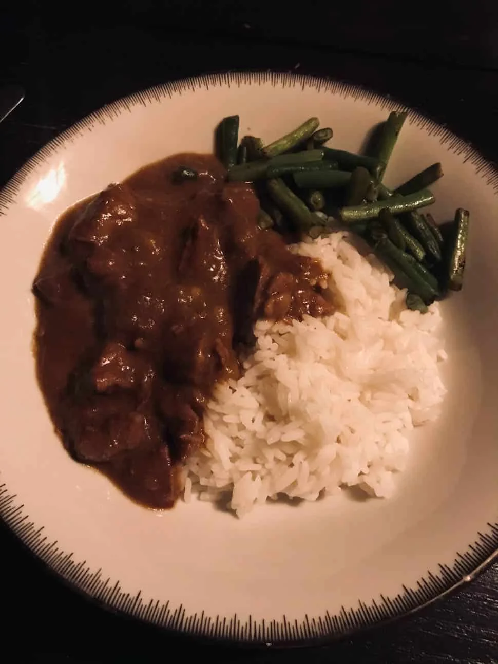 Het zat al een tijdje in mijn hoofd om eens rendang te maken. Ik heb het nog nooit zelf gemaakt en ik vind het echt een heerlijk gerecht. Zaterdag was ik toevallig even bij de toko bij ons om de hoek, en toen bedacht ik me daar dat ik ook wel even wat ingrediënten voor rendang mee kon nemen, zodat ik dat binnenkort kon maken. Dat werd dus de volgende dag al. Ruim zes uur pruttelen verder aten we dit met wat witte rijst een gewokte boontjes. En omdat ik zo ongeveer anderhalve kilo vlees in dat apparaat had gestopt, aten we hier maandag ook nog van. Recept van Sabine trouwens!