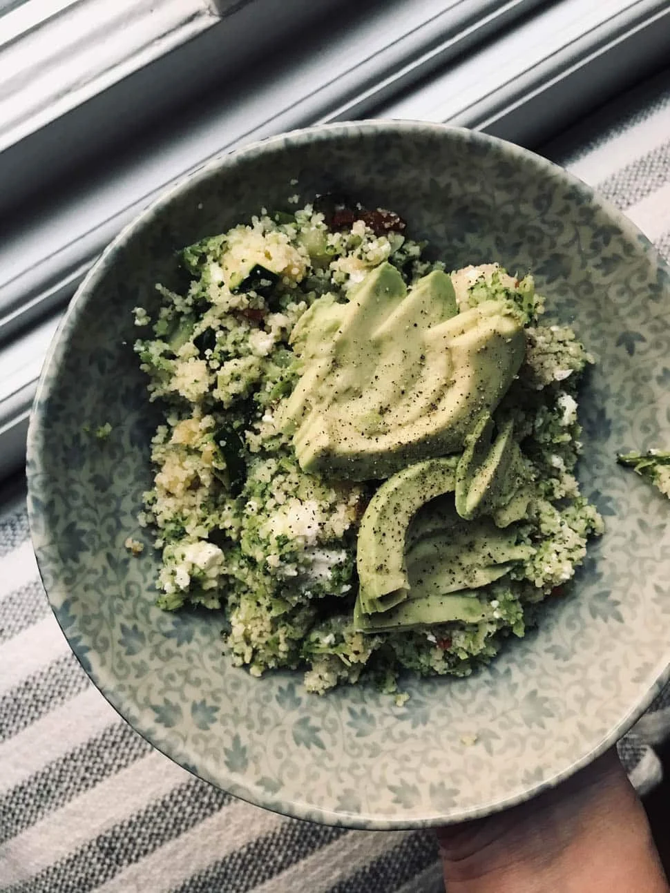 Dit gerecht lijkt misschien een beetje op dat wat we woensdag aten, maar het was compleet anders qua smaak. Het is ook een couscousgerecht maar dan op basis van broccolicouscous (die ik aanvulde met een beetje gewone couscous). En het was de bedoeling om dit te maken met halloumi, maar op de een of andere manier kon ik daar de afgelopen week niet aan komen. Het was even nergens te krijgen dus ik maakte het met witte kaas. Verder zit er in knoflook gebakken courgette in. Eigenlijk is het dit recept, maar dan iets anders omdat ik me een beetje moest aanpassen naar wat ik wel had, in plaats van niet ;-)