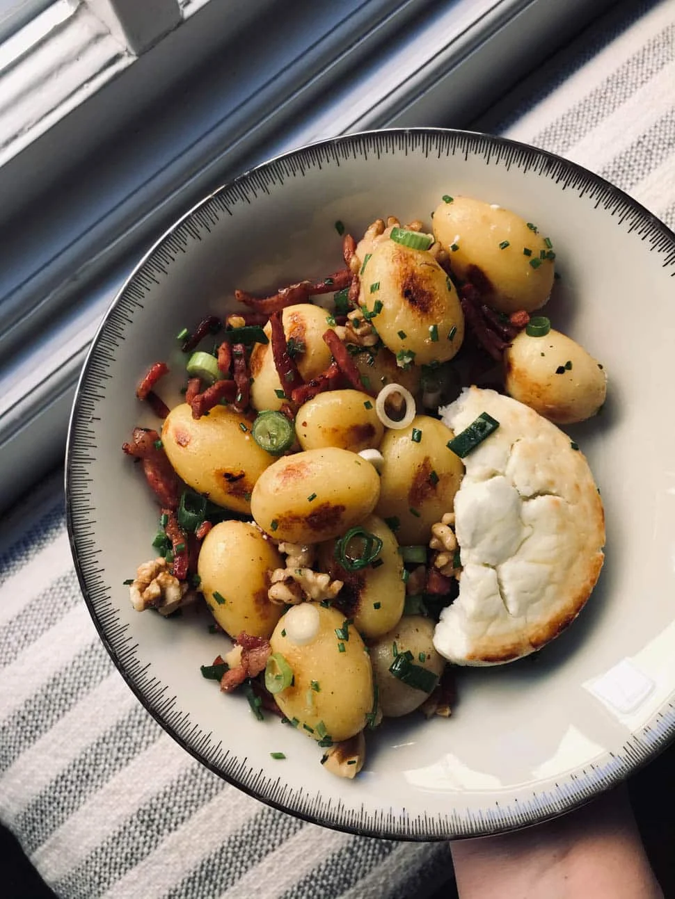 Ik had afgelopen vrijdag weer een OMF dag gepland staan en stond dus weer lekker te bakken en koken. Ik maakte onder andere deze krieltjessalade, met warme geitenkaas. Tobias is gek op geitenkaas dus je weet wel wie er direct van stond te eten toen ik het op de foto had gezet ;-)