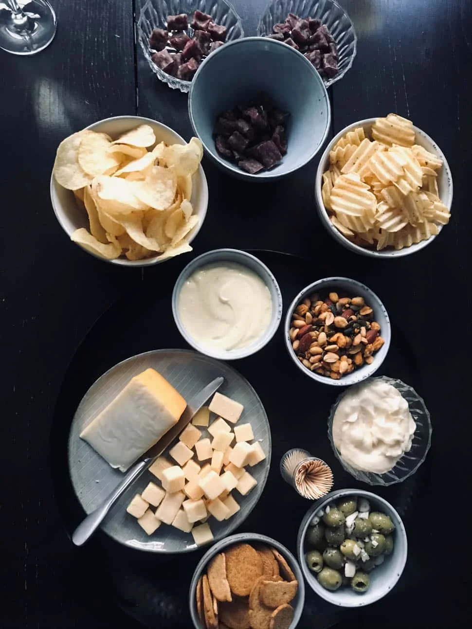 Ja! Borreltijd. Want veel verder dan dit komen we tegenwoordig niet als het om avondjes uit gaat. En dan is het heel simpel; we feesten de boel gewoon lekker zelf een beetje aan. Ik had al een aantal dingen in huis gehaald, en op de markt kochten we gisteren nog wat droge worst. Prima zaterdagmaaltijd.