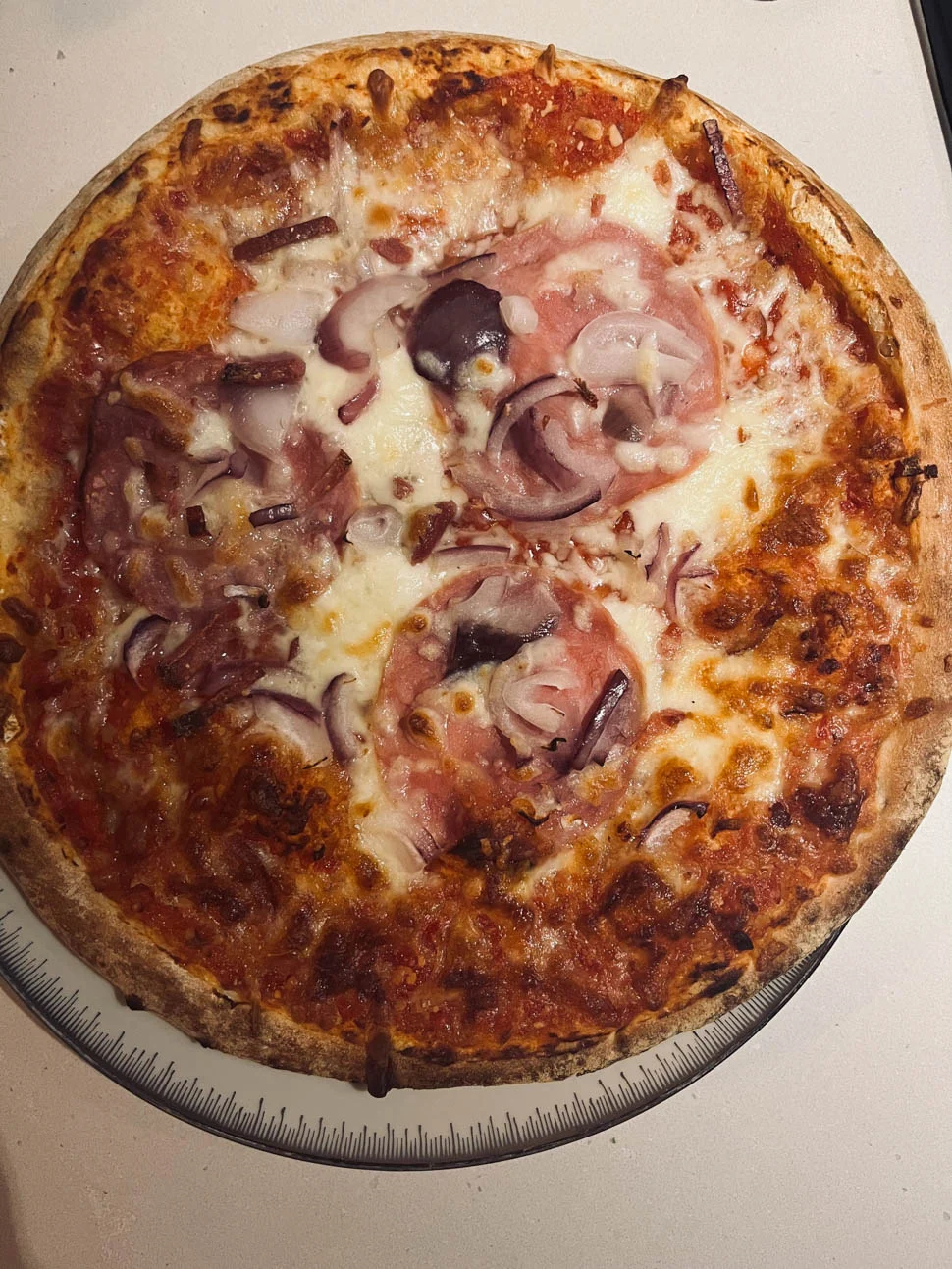 Ik haal vaak dezelfde soort pizza’s in huis omdat ik nou eenmaal een zwak heb voor die dunne van Dr. Öetker met salami, champignons of kaas. Maar, bij zowel de Laidl als de Appie kwam ik nieuwe, andere pizza’s tegen die ik het uitproberen waard vond. Die van de Appie at Tobias, ik geloof iets met kip en een Mexicaanse twist. Geen idee meer eigenlijk maar hij was verrassend lekker zei Tobi. Ik at deze van de Lidl en die was belegd met ham, mozzarella en ui. En die was dus óók heel smakelijk. Voor een diepvriespizza dan hè. Laten we wel wezen. Maar het blijft gewoon een guilty pleasure.