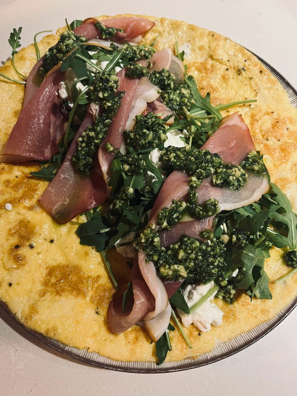 Oké, gezonde hap no. uno! Ik maakte een ei-wrap en belegde deze met rucola, cottage cheese, pesto en rauwe ham. We zijn momenteel even flink fan van cottage cheese want dat is dus echt een lekkere frisse aanvulling op gerechten zoals dit.