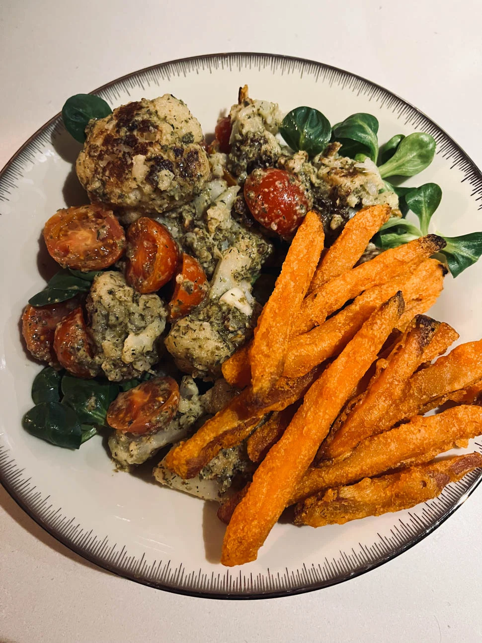 Ik maakte weer eens de gebakken bloemkool van Ottolenghi, met een dressing van kappertjes/mosterd/dille en tomaatjes en veldsla. Heel lekker om zo te eten vinden wij, al is het van origine geloof ik een bijgerecht. Deze keer bakte ik er wat krokante zoete aardappel friet bij. Óók erg lekker. Overigens niet zelf gesneden, maar gewoon uit de diepvries van de Appie. Ik wilde die wel eens uitproberen namelijk want zelf zoete aardappel krokant krijgen in de oven blijft een ingewikkeld dingetje.