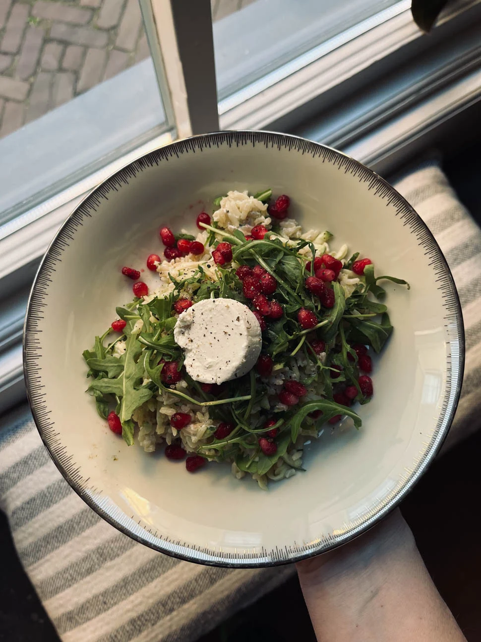 Ik kookte vrijdag al vroeg en kon weer eens een foto bij daglicht maken – HOERA, ik kan niet wachten tot de klok verzet wordt. Ik maakte een rijstsalade met courgette, rucola, granaatappelpitjes en geitenkaas. Lekker fris!