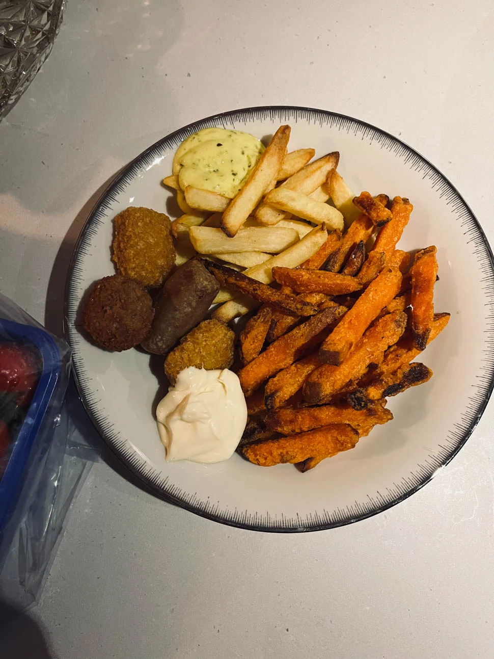 Ik heb tegenwoordig vaak wel een zak ovenfriet in de vriezer liggen en dat is dus i-de-aal voor een avond in het weekend als je het mij vraagt. Gisteren maakte ik de zoete aardappelfriet nog even op, met erbij nog wat gewone frietjes en een paar snackies.