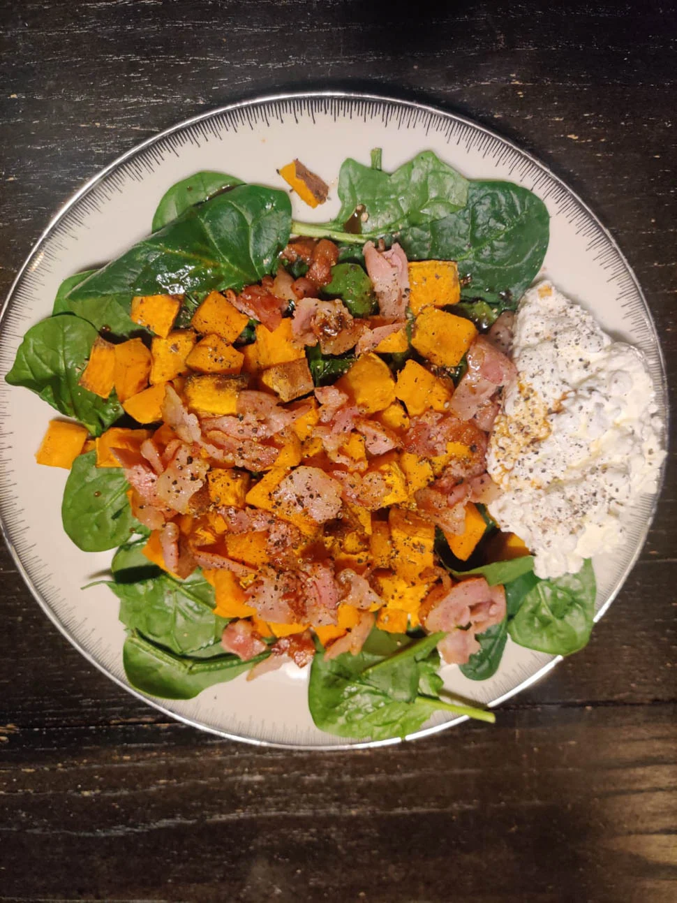 Tobias kookte donderdagavond terwijl ik nog een paar lessen gaf bij de Barbell Club in Apeldoorn. Ik at van tevoren een bakje kwark met banaan en eenmaal terug stond dit bordje salade op me te wachten (hij had er zelfs al de foto van gemaakt, wat een topper hè). Zoete aardappel met spinazie, gebakken spek, balsamico en cottage cheese.
