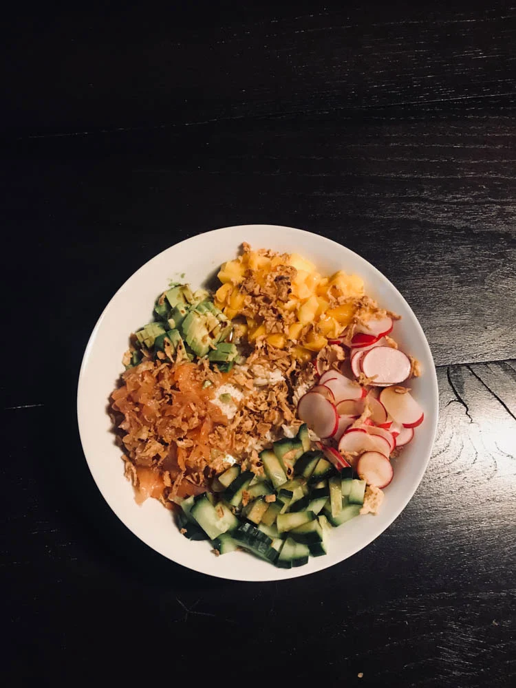 Nee, die pizza liet ik dus lekker in de vriezer liggen. Ik had zó’n zin in een poké bowl! Ik vulde deze mega schaal (oké, het was teveel) met rijst met wasabimayo, gerookte zalm, komkommer, radijs, mango, avocado, gebakken uitjes, sesamolie en sojasaus. HEEL lekker. HEEL erg van genoten.