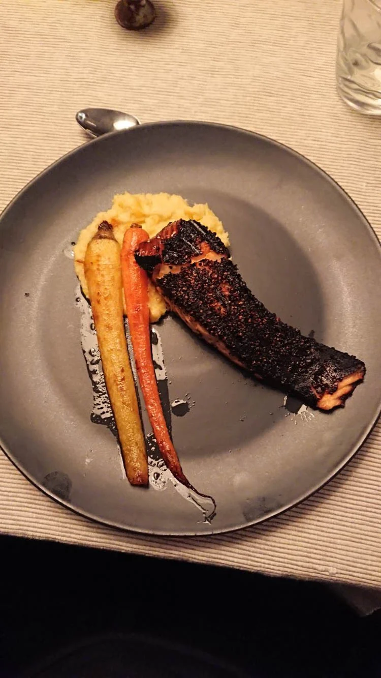 Ja, dit aten we allemaal afgelopen zondagavond. Lekker hoor! Eerst dus het soepje van Sab, daarna een avocadomousse met zalm, rucola en een sesamdressing. Hoofdgerecht bestond uit een moot zalm in een marinade (vandaar de zwarting, het is dus marinade, niet aangebrand) en na appeltaart. Ik vind dat dus echt top hè, een stuk taart na het diner. Ik krijg dat zonder moeite weggewerkt.