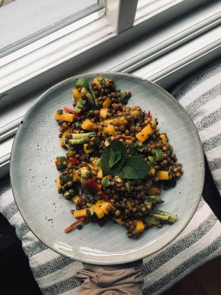 Op oudjaarsdag at ik een bordje van deze salade die ik voor OMF had gemaakt. Ik at bewust niet teveel want we gingen een avond tegemoet met veel hapjes, taart en oliebollen.